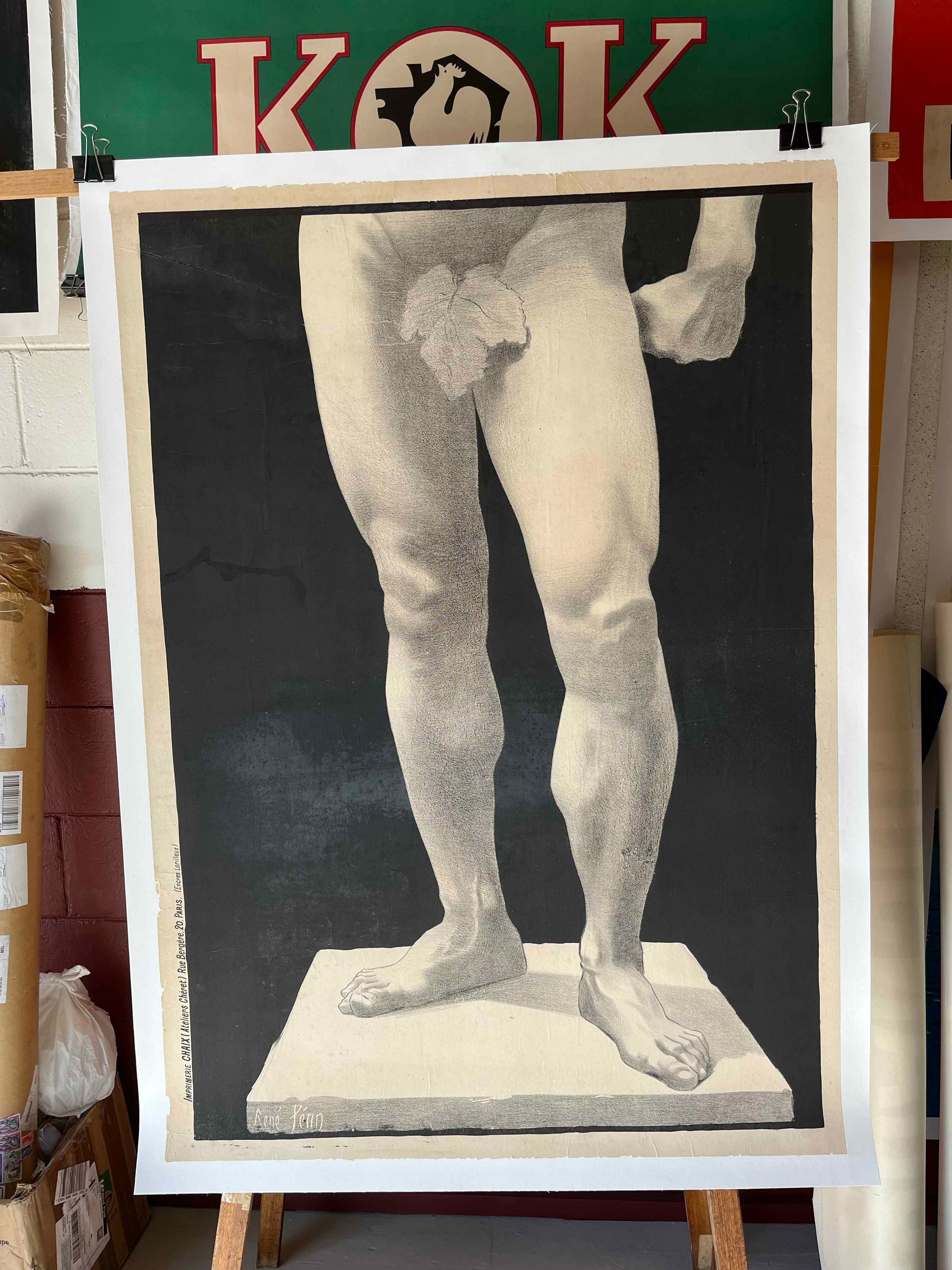 A finely executed antique academic drawing depicting a male nude from the waist down. The figure's legs are rendered with anatomical precision, and a leaf modestly covers the genital area – a classical artistic motif. A compelling example of traditional figure study with subtle classical symbolism.
