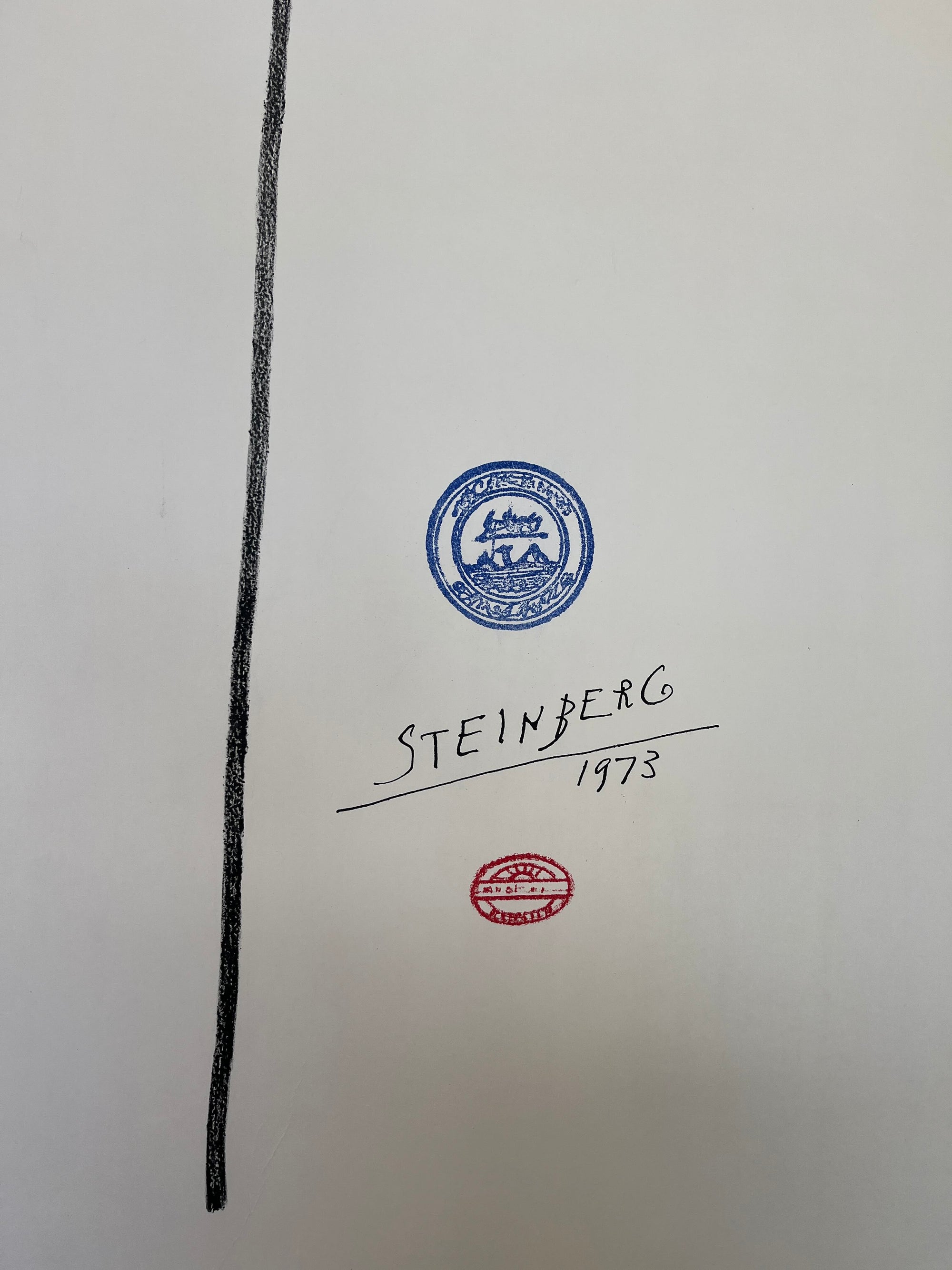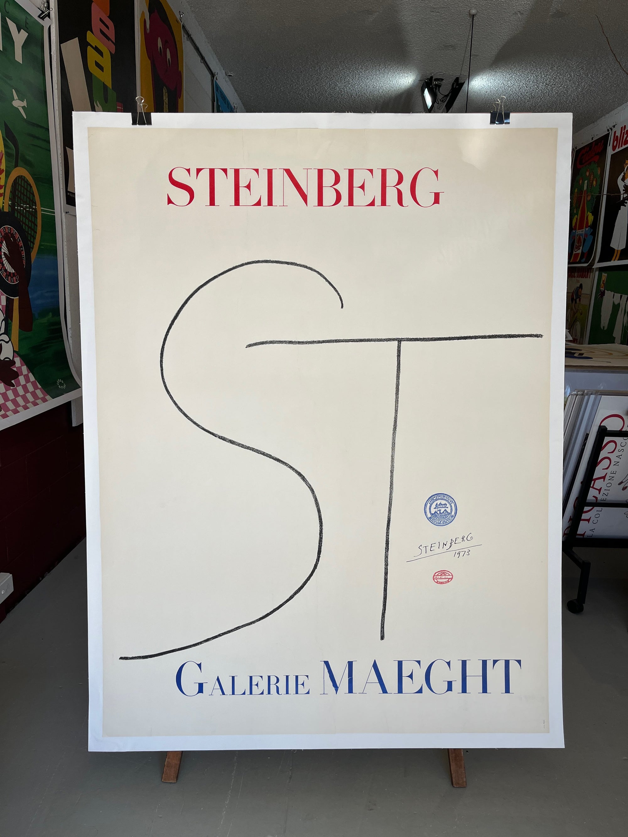 His Galerie Maeght posters – like the bold 'ST' design – reflect his playful use of typography and abstraction. Steinberg is celebrated as a major 20th-century visual artist whose work remains influential and collectible.
