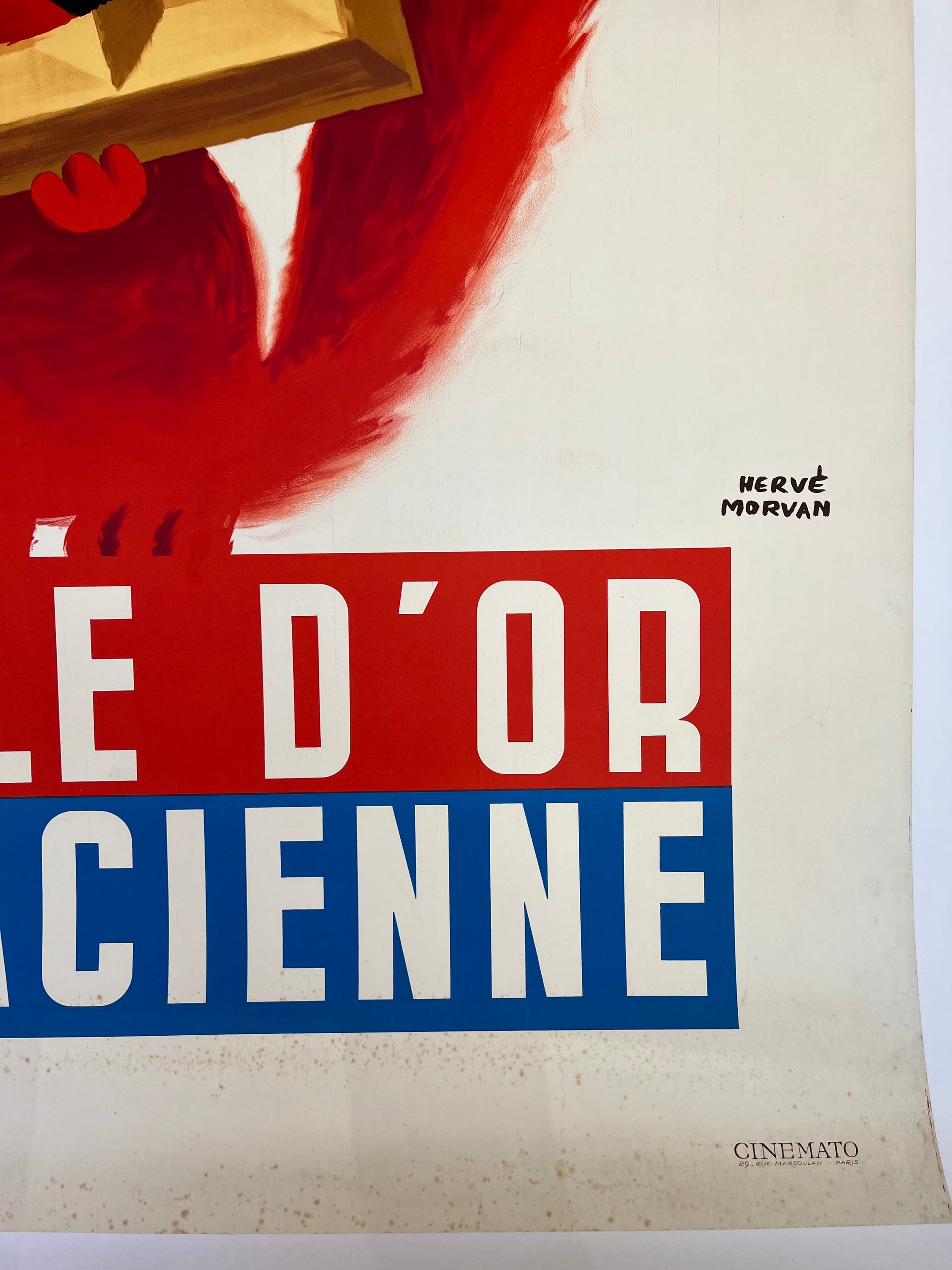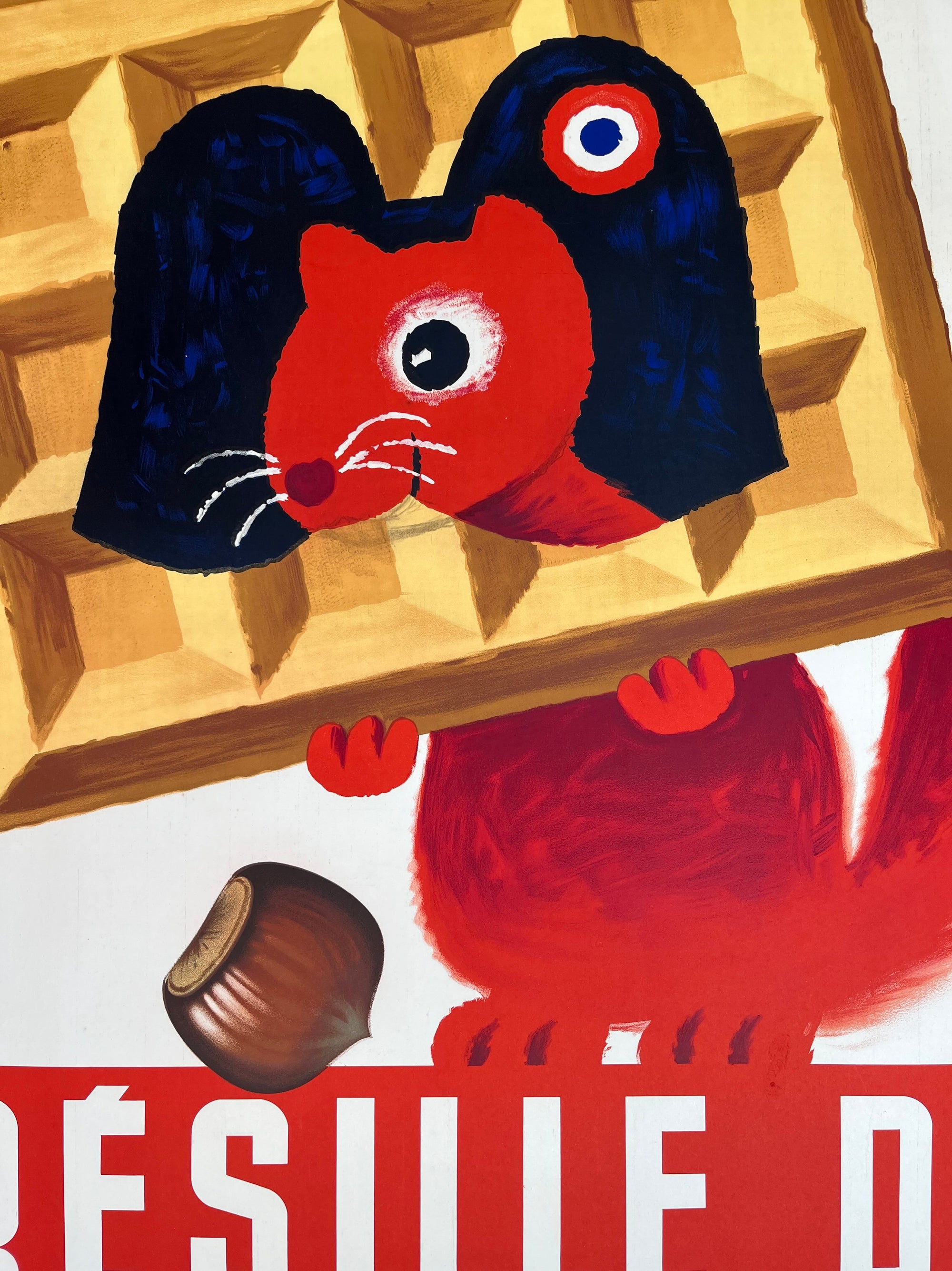 Vintage French advertisement for L'Alsacienne biscuits, designed by Hervé Morvan in the 1950s–60s. It features a playful squirrel holding a waffle-textured biscuit, reflecting the product's delicate design. Morvan’s signature style – bright, friendly, and simple – makes the poster charming and memorable. It’s a collectible piece, loved for its whimsical character and nostalgic mid-century appeal.