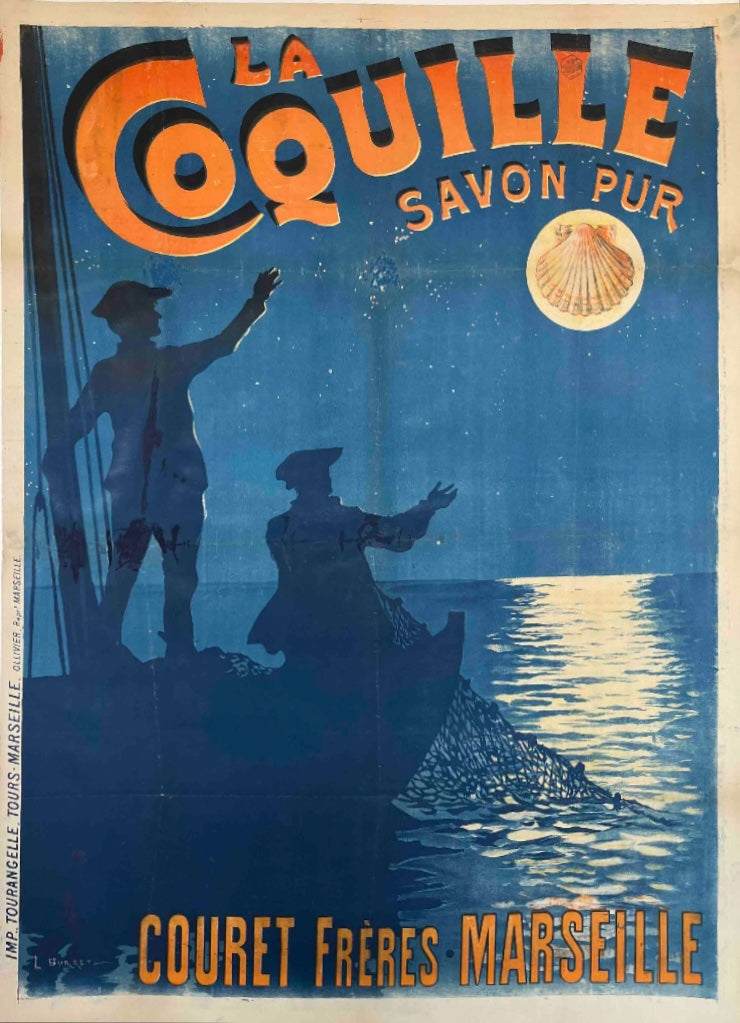 This early 20th century French advertising poster promotes La Coquille – Savon Pur (Pure Soap) by Couret Frères of Marseille. Likely dating to circa 1900-1910, it features silhouetted fishermen working by moonlight, a poetic maritime scene that evokes purity, tradition and the coastal identity of Marseille. With its rich blue palette, shell emblem and bold lettering, the lithograph is a beautifully atmospheric example of classic French commercial design.