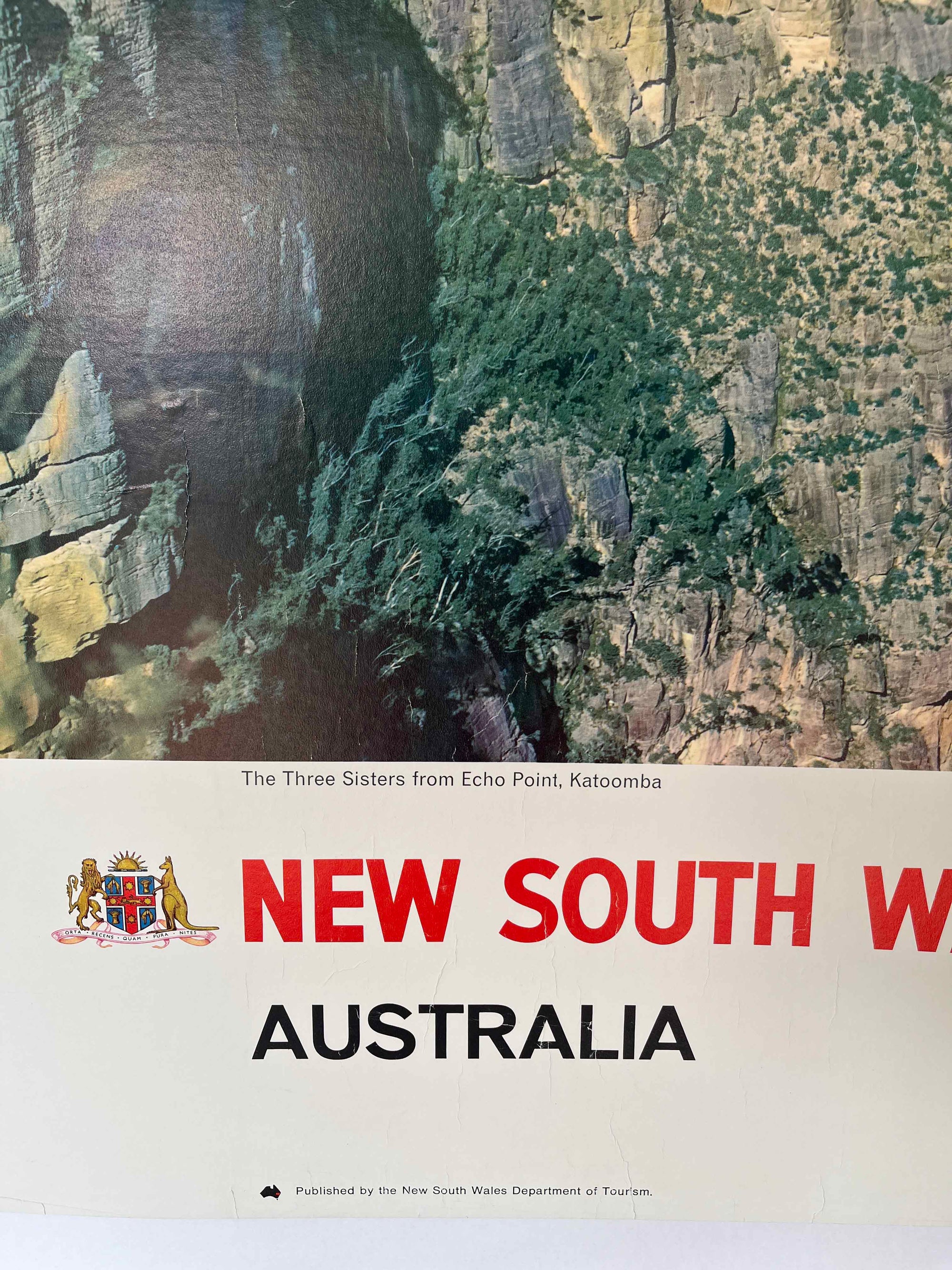Issued by the NSW Department of Tourist Activities around the mid-20th century, the poster features a striking photograph of the landmark viewed from Echo Point, Katoomba. It was part of a campaign to showcase Australia's natural beauty, and original copies are now considered valuable collector's items.