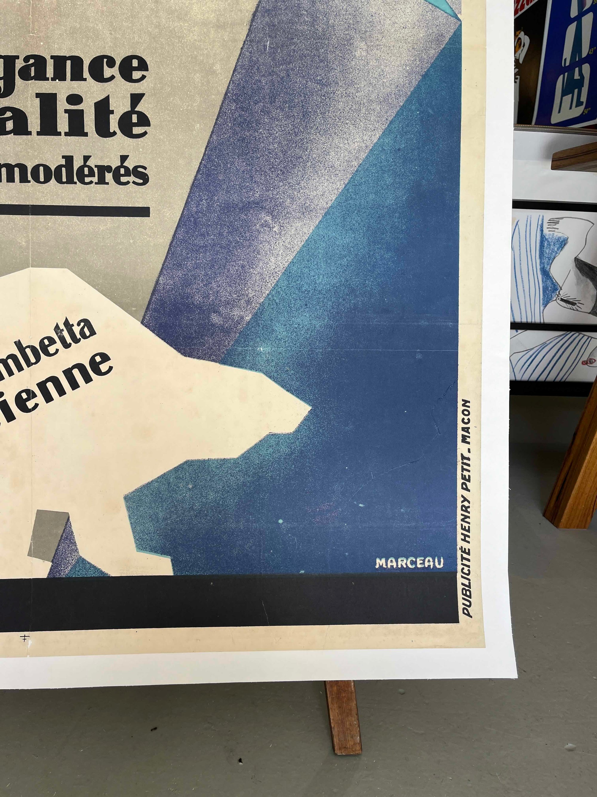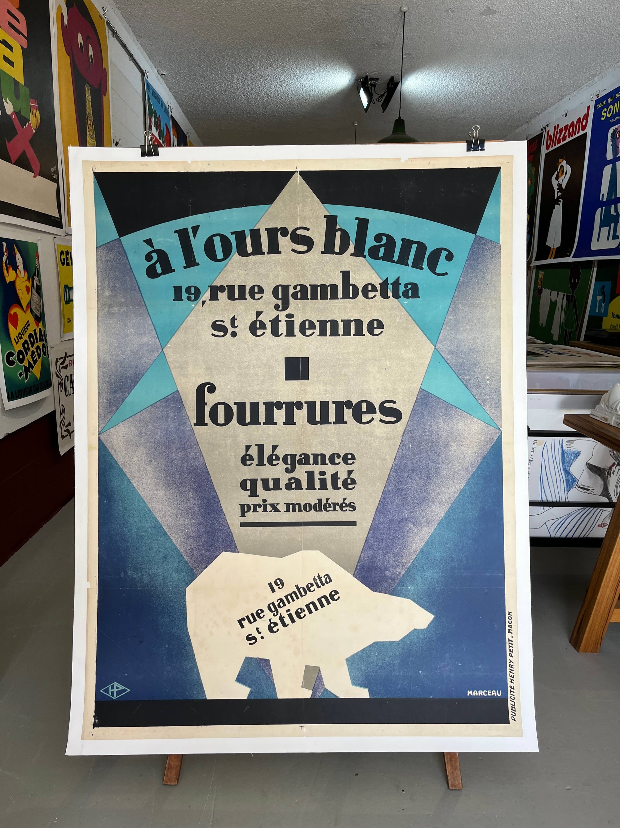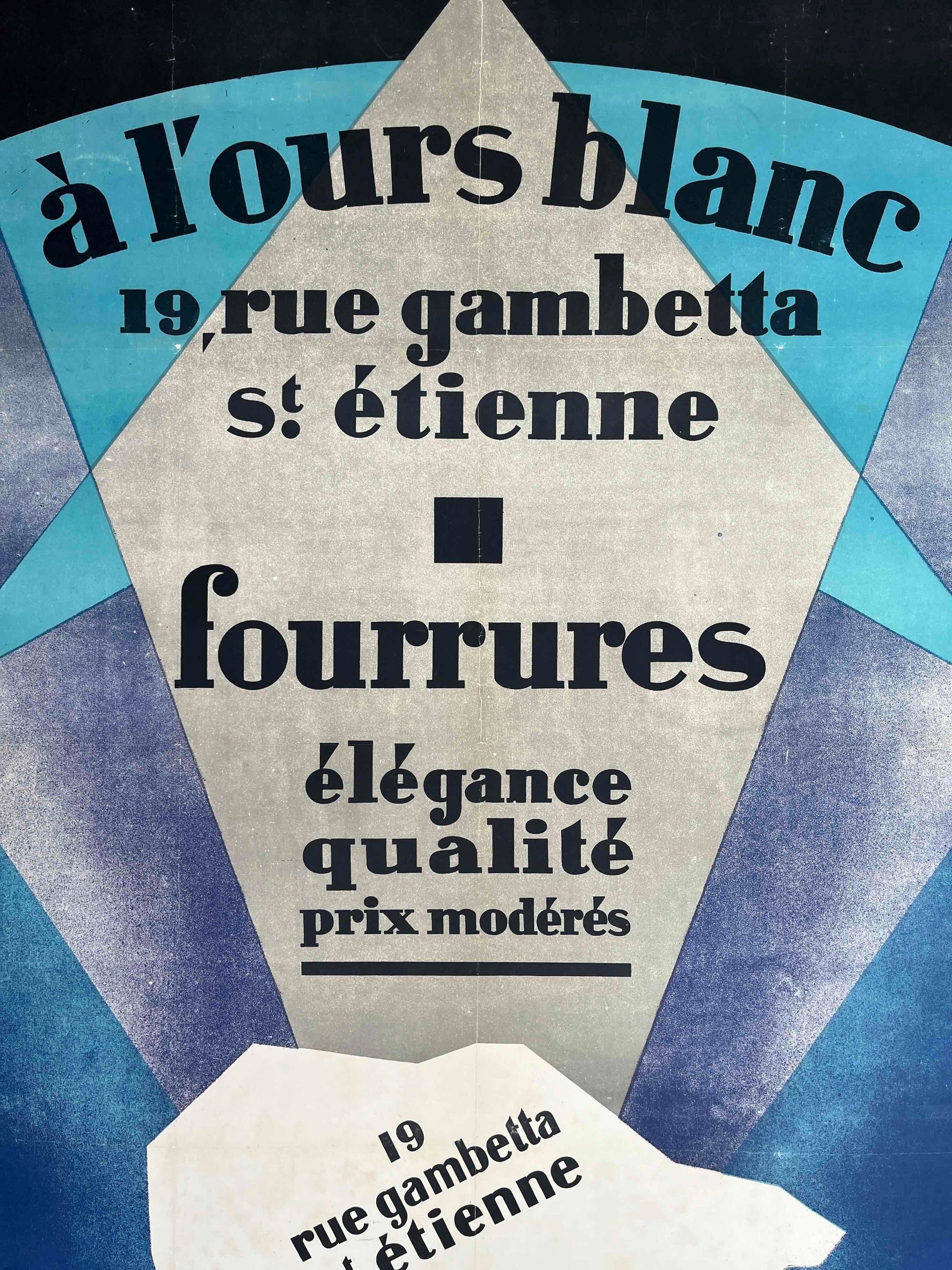 This is an advertisement for a furrier shop called 'À l'Ours Blanc' (To the White Bear) located at 19 Rue Gambetta in Saint-Étienne, France.