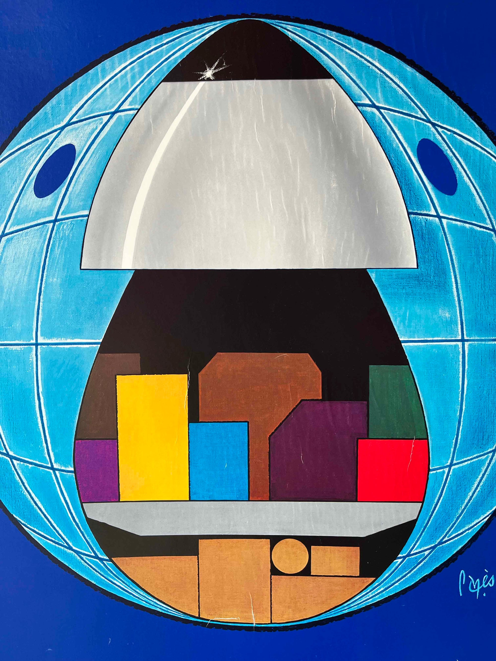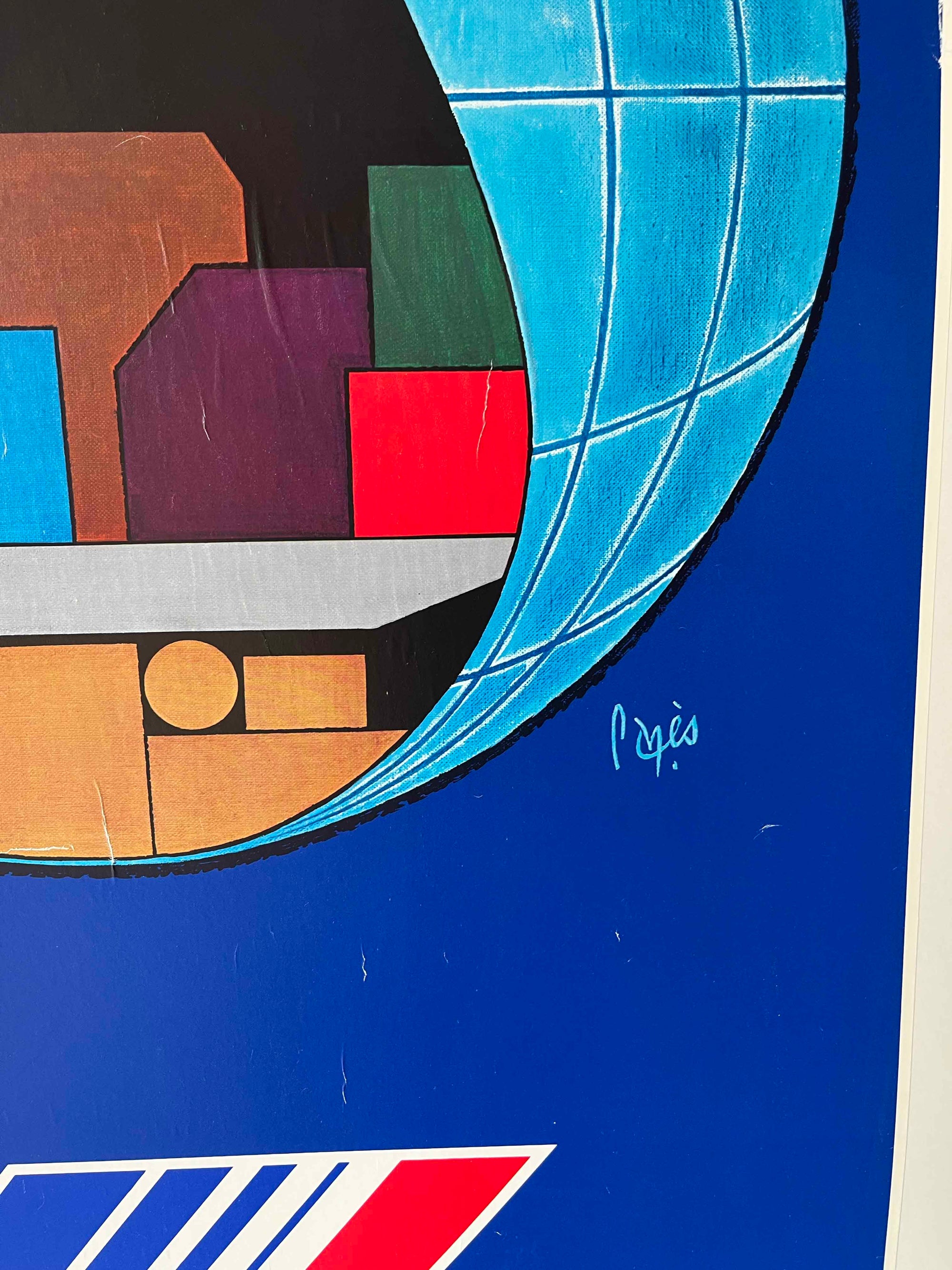 The Air France Cargo poster from 1979 is a striking example of late-1970s French graphic design, promoting the airline’s global freight services. Featuring bold typography, minimalist geometry, and Air France’s signature blue palette, it reflects the era’s shift toward modern, corporate visual style. Printed in France for trade and airport display, the poster embodies Air France’s image of worldwide reliability and technical sophistication.