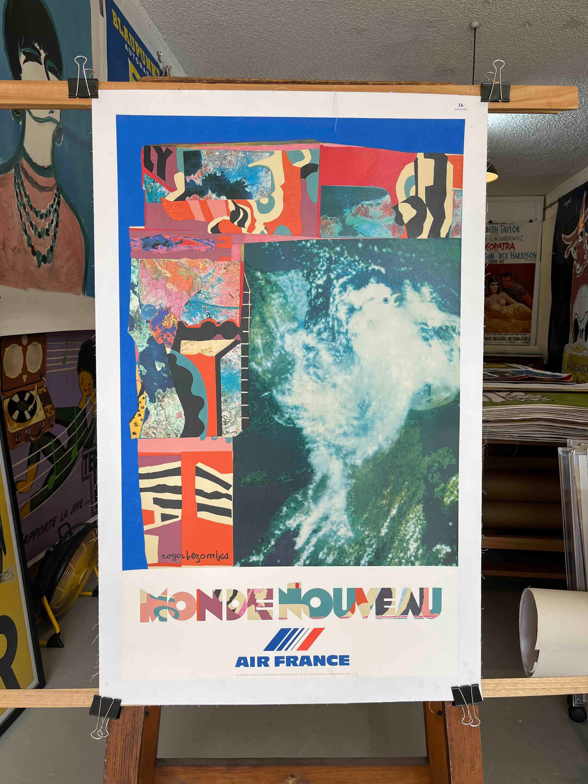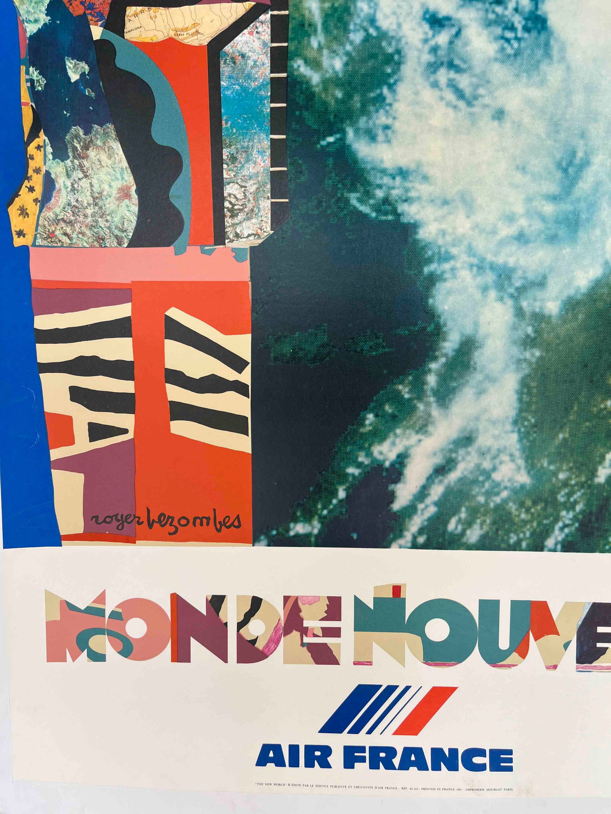 This striking travel poster was created by the French artist Roger Bezombes for Air France in the late 1960s. Titled 'Monde Nouveau' ('New World'), the design promotes the excitement of international travel during the jet-age era, when Air France was expanding its long-haul routes across the Atlantic and beyond.