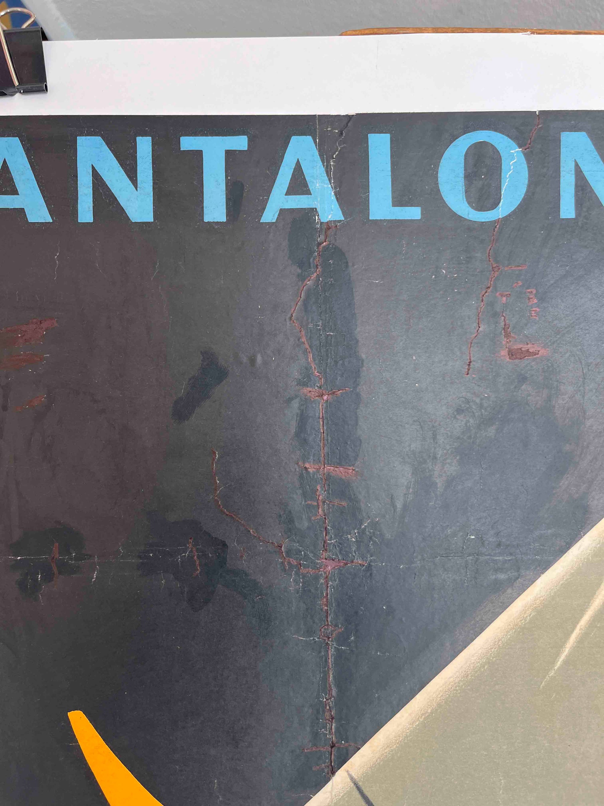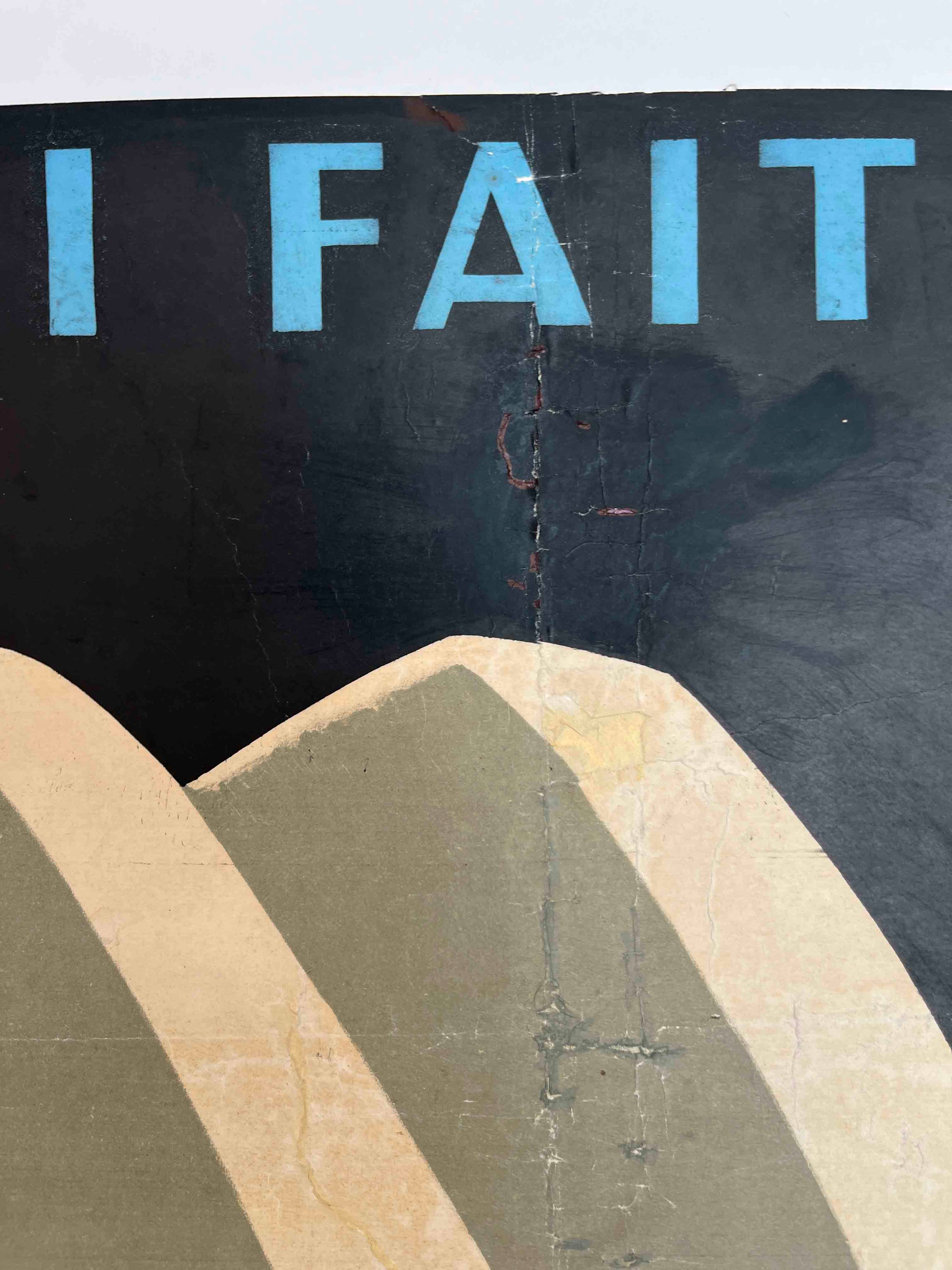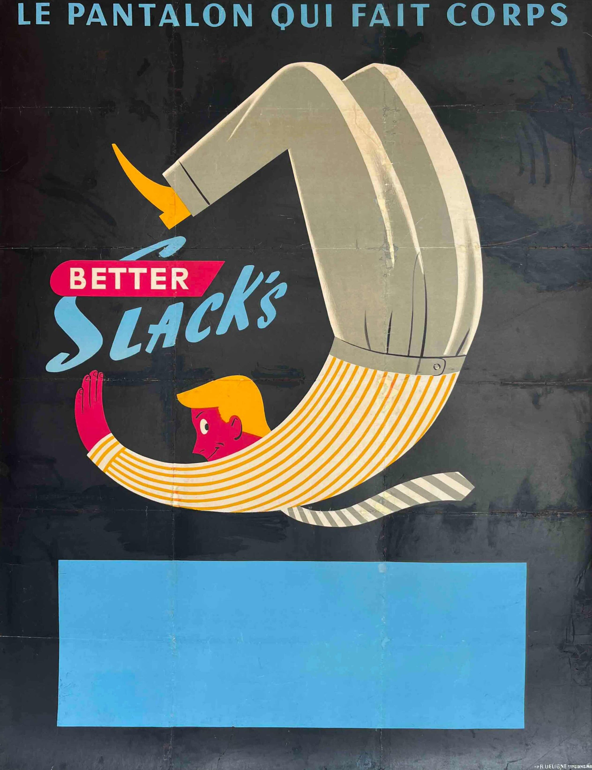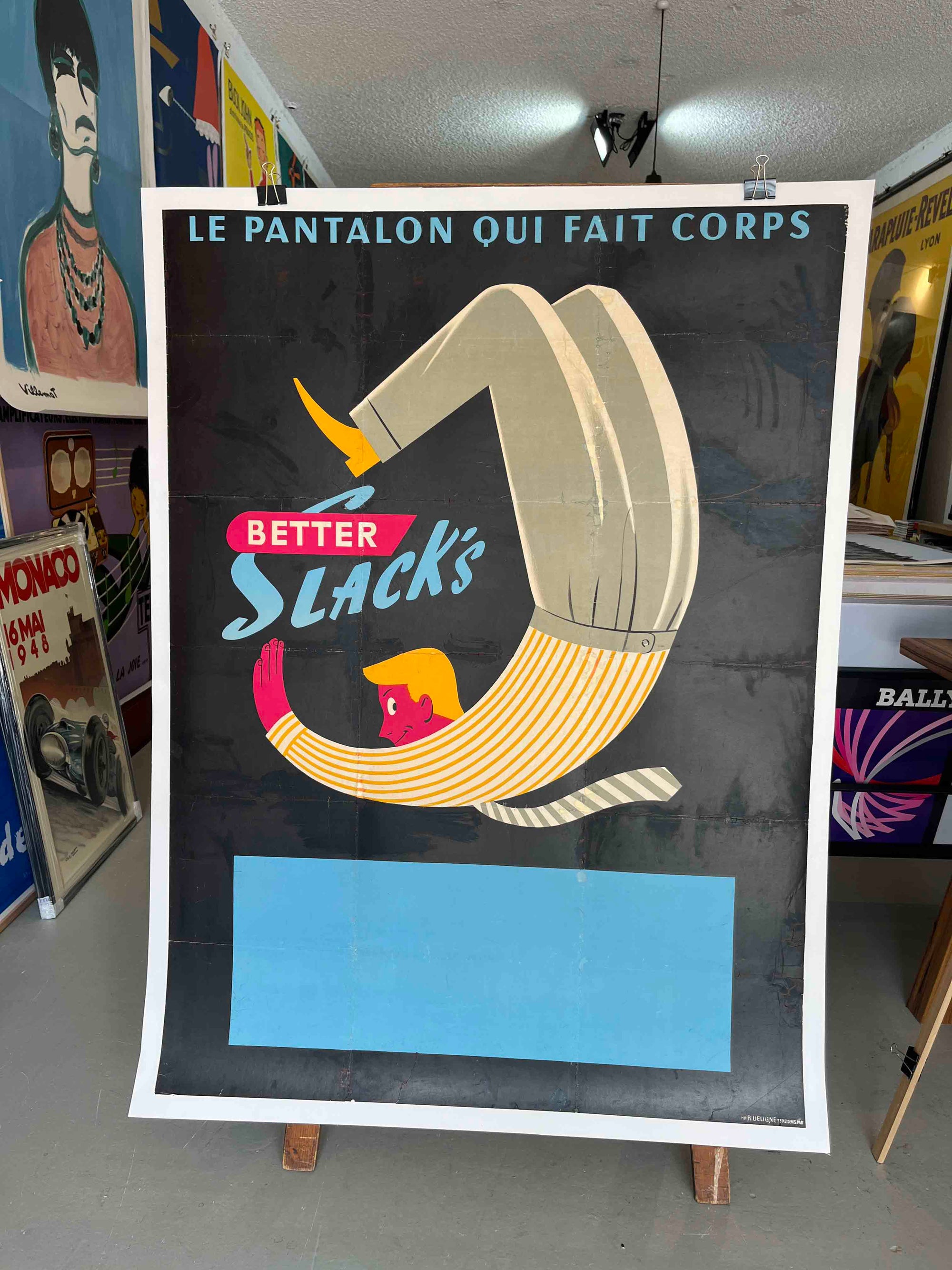 A witty mid-century French advertising poster for Better Slack’s, featuring the slogan 'Le pantalon qui fait corps' ('The trousers that become one with you'). Likely dating from the late 1940s to early 1950s, the design uses a clever visual metaphor – a man literally folded into the shape of a pair of trousers – to suggest comfort and perfect fit. With its bold flat colours, graphic typography and playful surrealism, it’s a sharp example of post-war European commercial design.