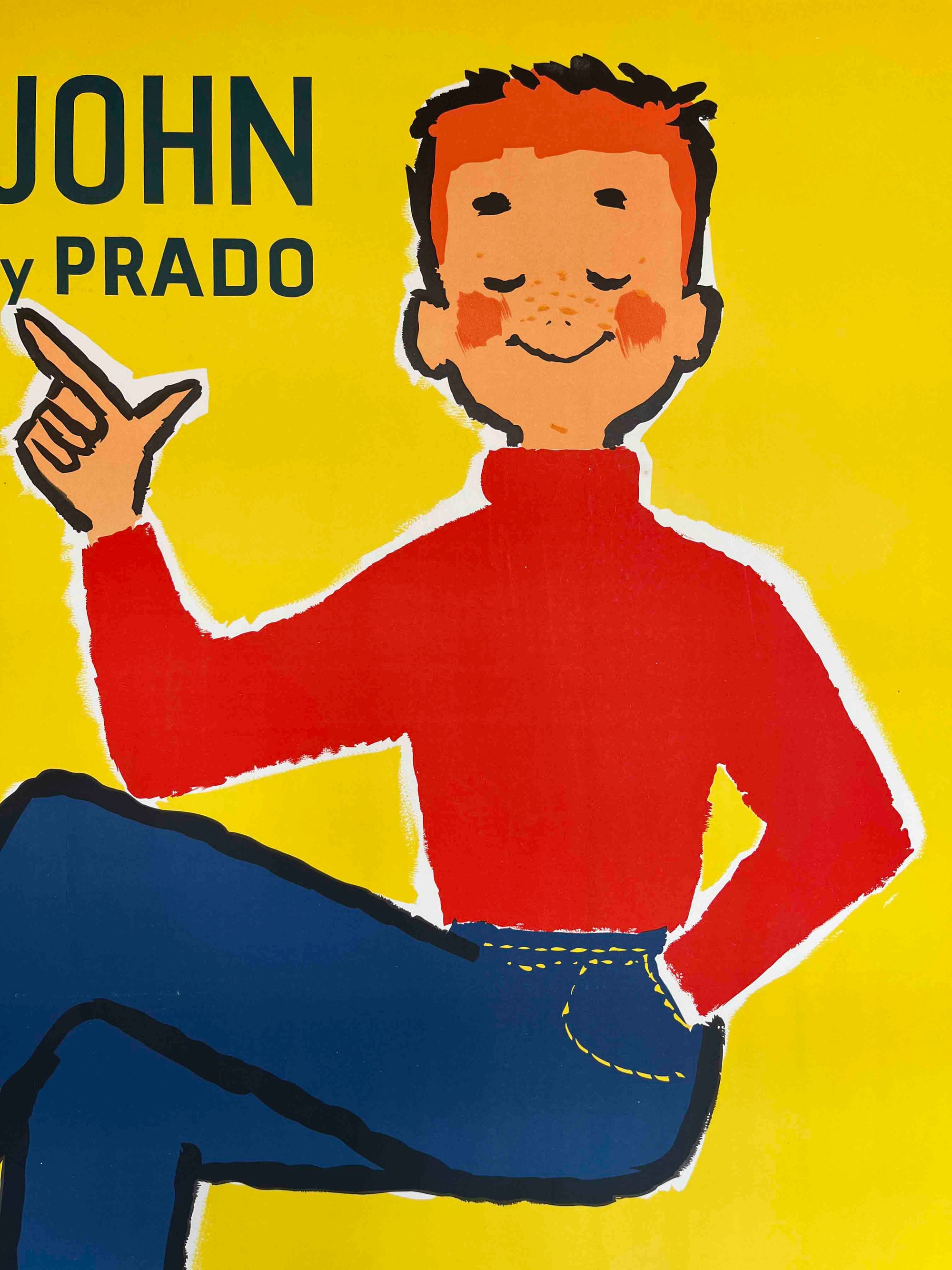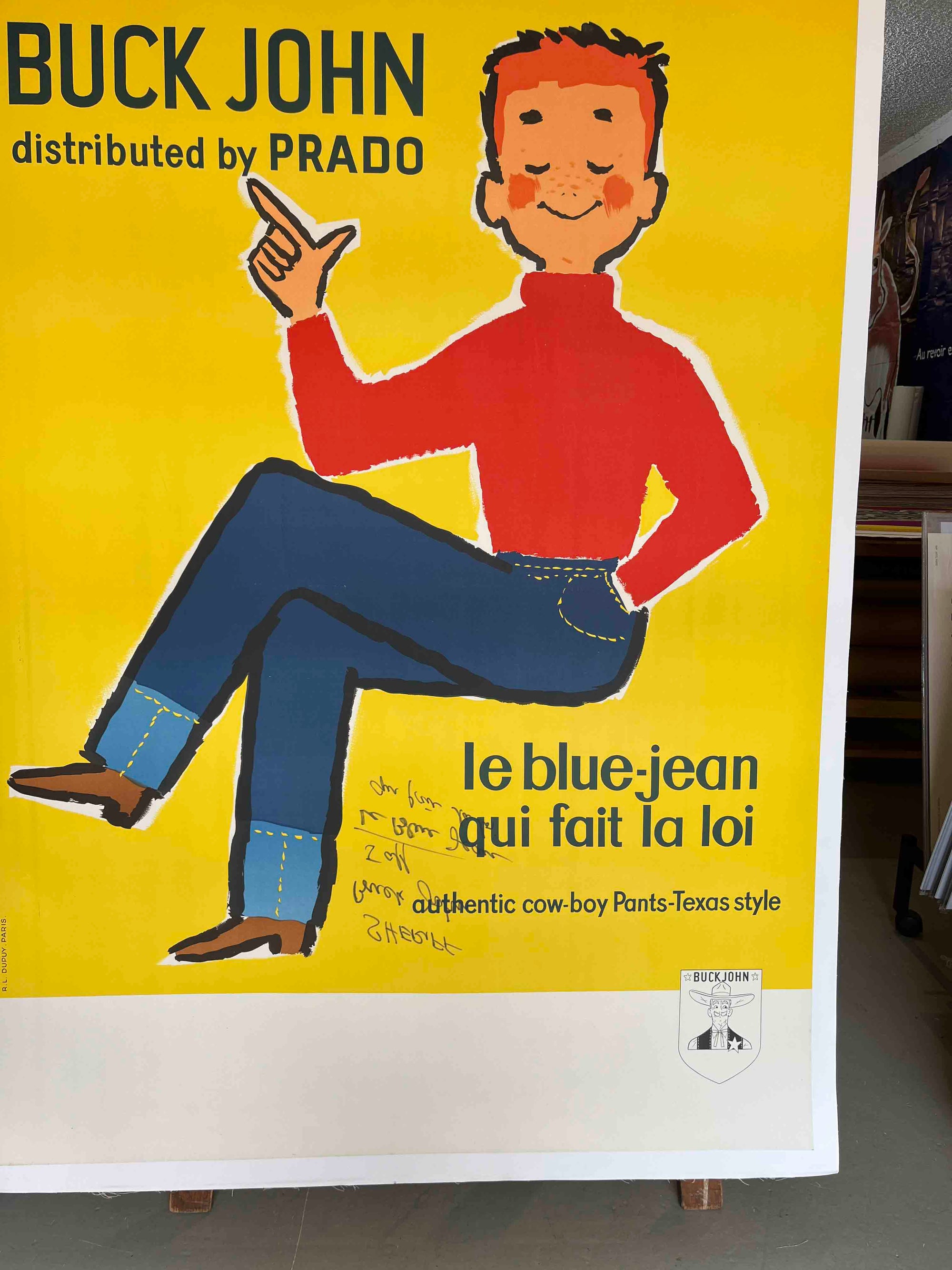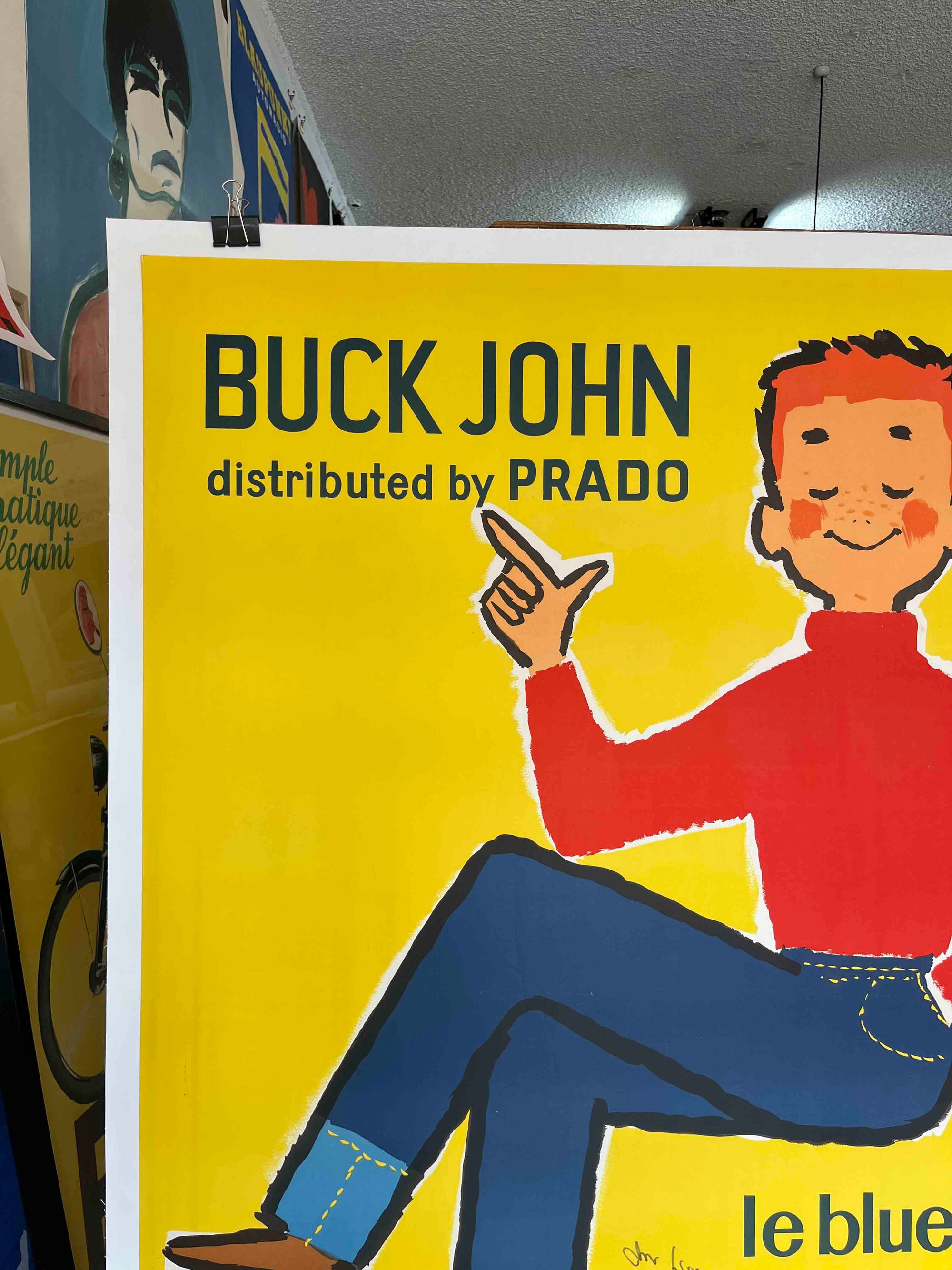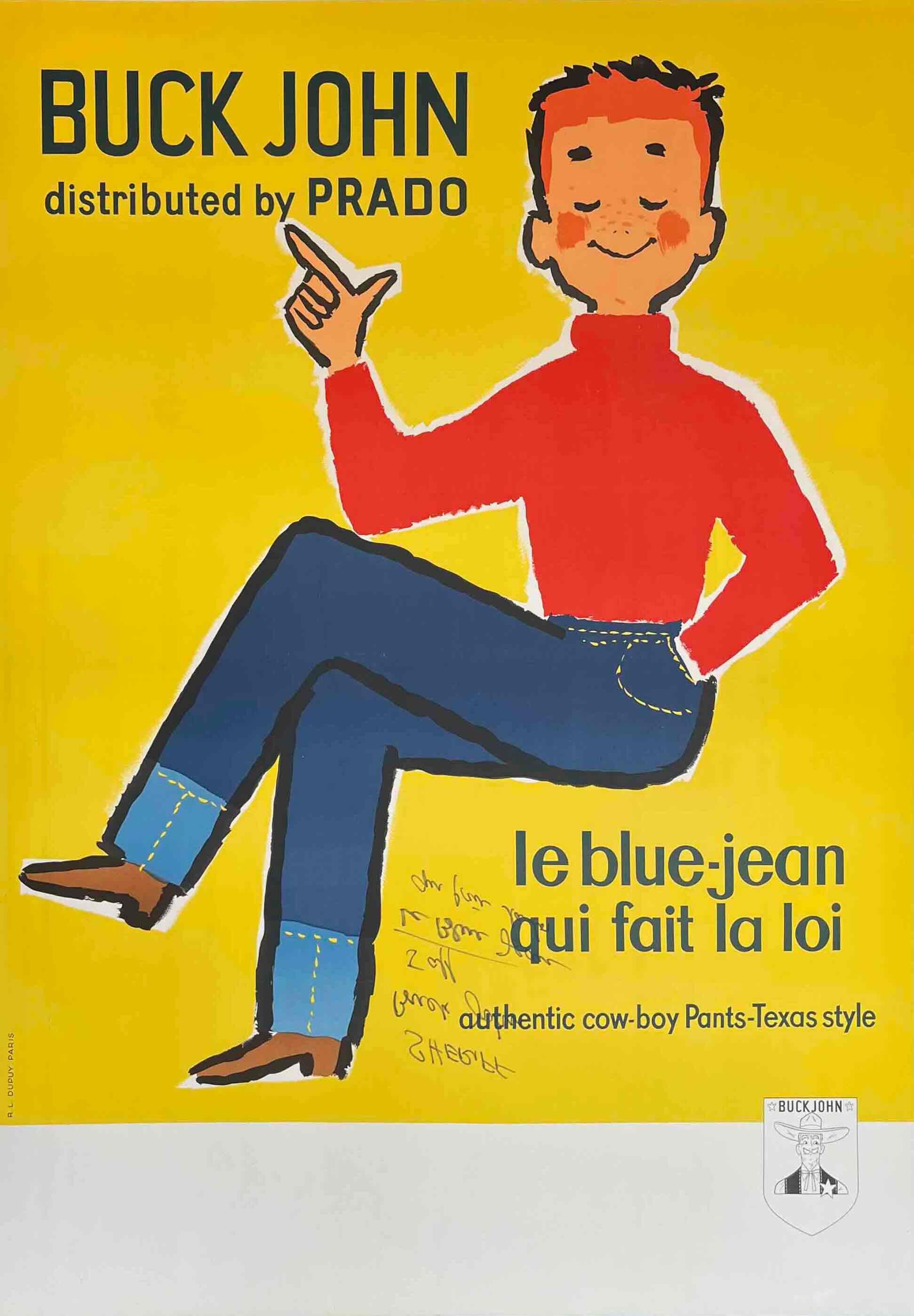 This charming mid-century French poster advertises Buck John jeans, distributed by Prado, with the slogan 'le blue-jean qui fait la loi' ('the blue jean that sets the law'). Featuring a playful, cartoon-style cowboy in bold primary colours, it reflects the 1950s-60s European fascination with American Western culture and denim as a symbol of youth and modernity. Printed in Paris by R.L. Dupuy, it’s a vibrant example of post-war French commercial graphic design celebrating the rise of blue jeans as a global fashion staple.