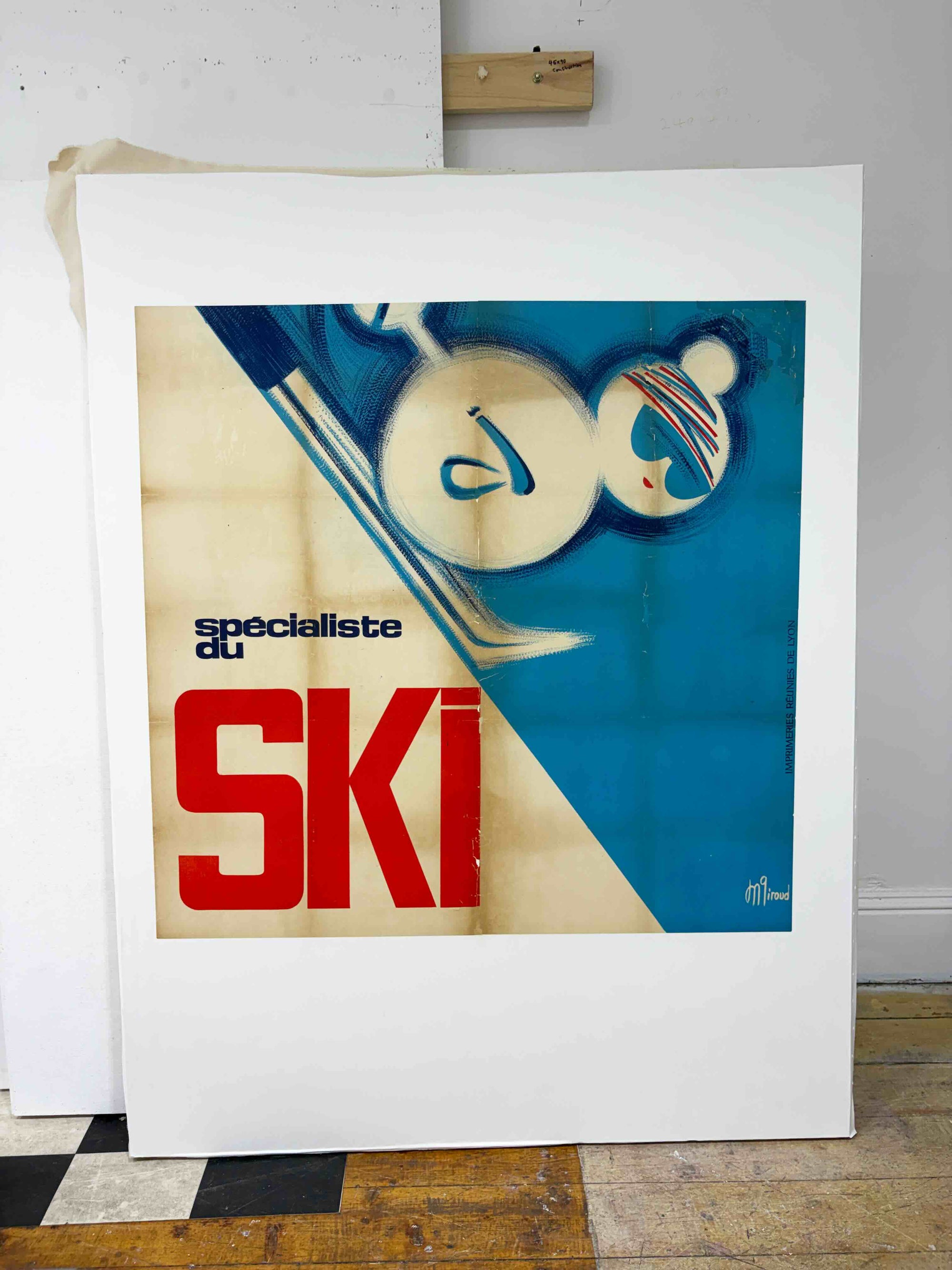 This vintage French Ski poster, titled 'Spécialiste du SKI,' is a mid-century advertisement featuring a minimalist, abstract illustration of a skier. Created by the artist Miroud and printed by Imprimeries Réunies de Lyon, it exemplifies the bold graphic style of the 1950s and 60s. Today, it is recognised as a collectible piece of winter sports history, valued for its modernist design and association with the French Alps region.