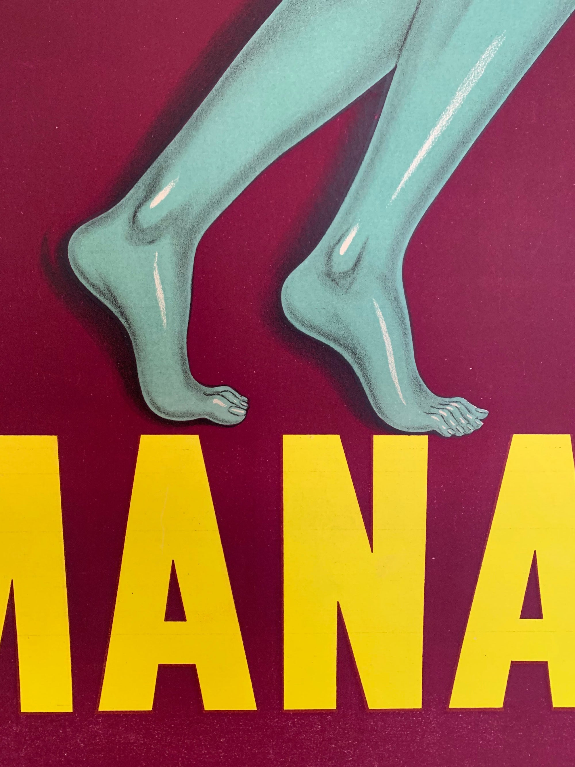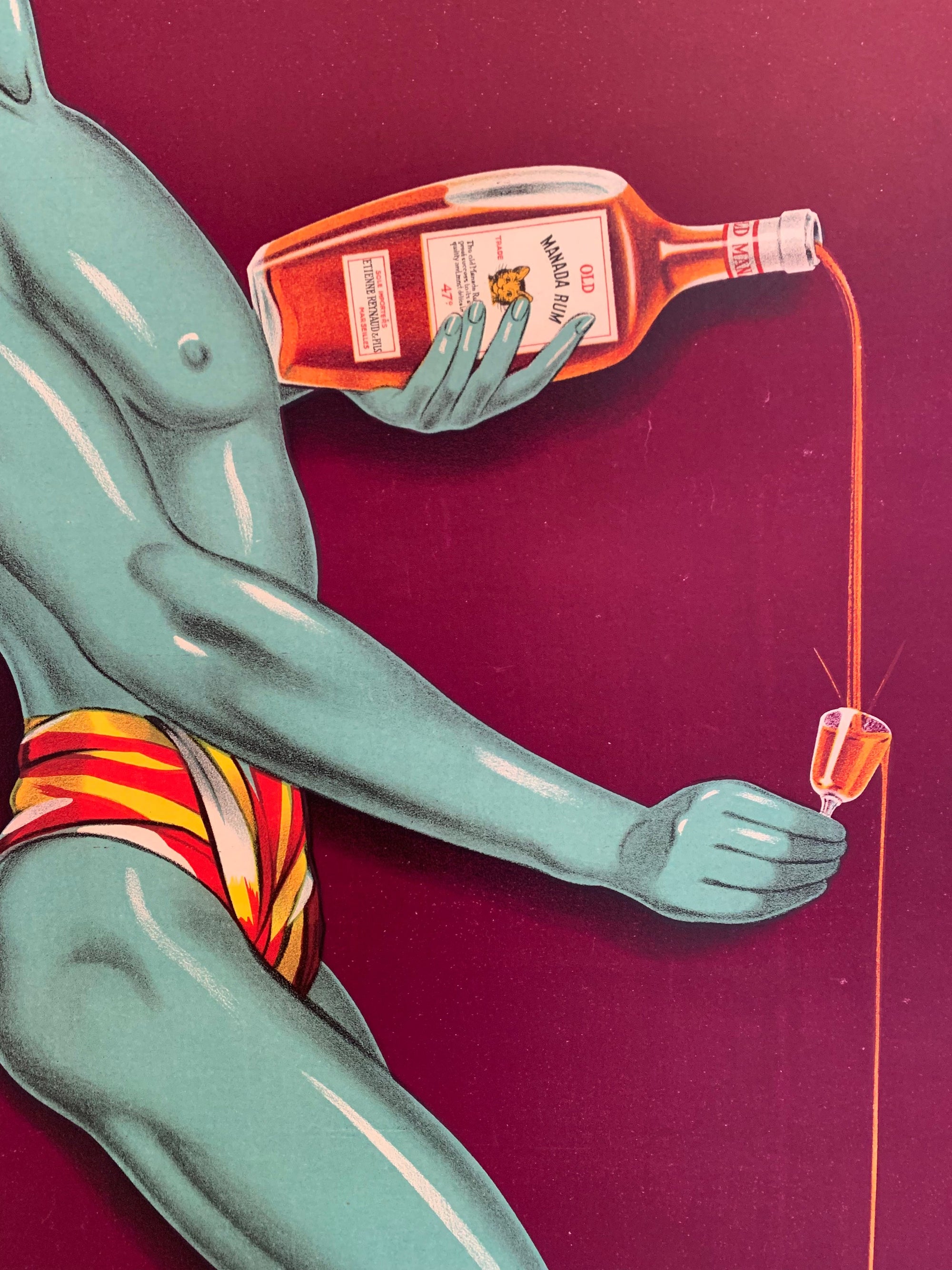 The Old Manada Rum poster, created in France around the 1930s by an unknown artist, is a large stone-lithograph known for its vivid 'green man' figure pouring rum against a dark background. Likely printed by Publicité Orcel, it exemplifies the bold, exotic advertising style of the era and remains a striking example of early 20th-century French commercial art.