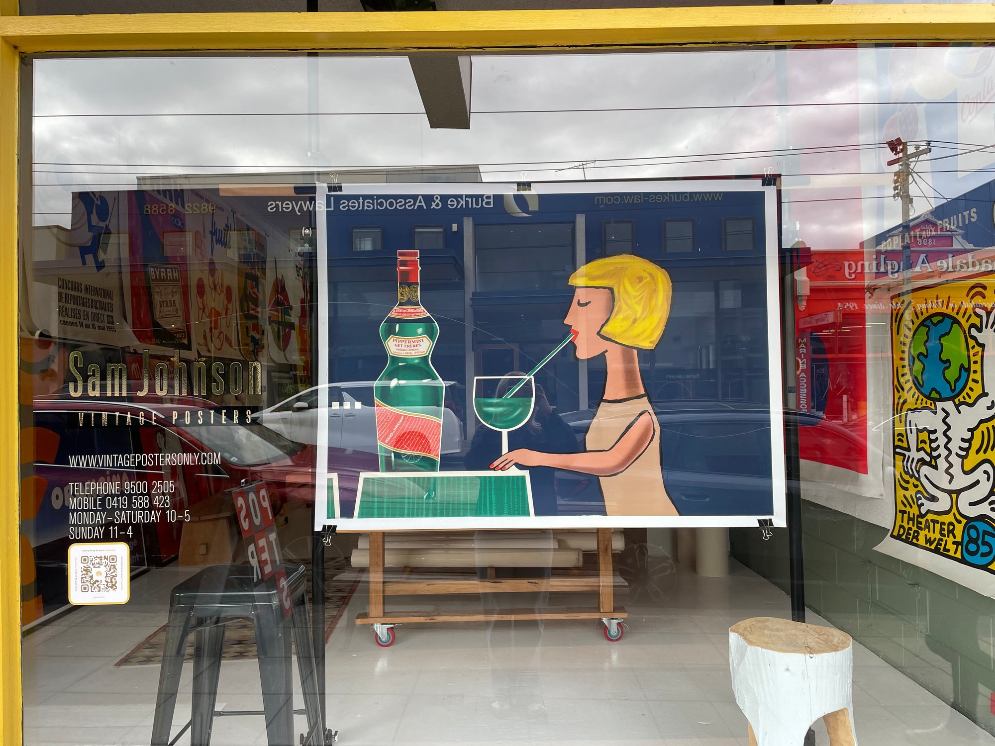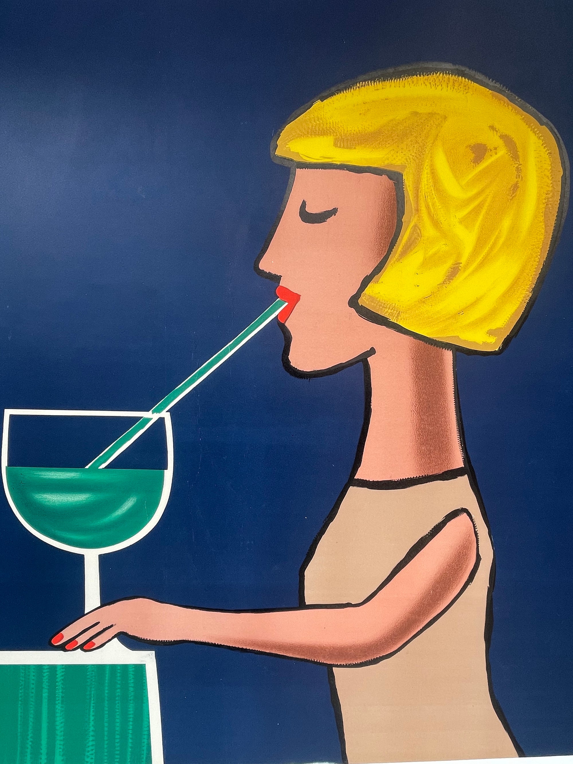 This 1950s advertising poster by Raymond Savignac for Peppermint Get Frères perfectly captures his signature visual wit. A stylised woman sips the vivid green liqueur through a straw seemingly connected to the bottle, cleverly conveying freshness with simple, bold forms and flat colour. Set against a deep blue background, the design is playful, modern and a classic example of Savignac’s minimalist mid-century French style.