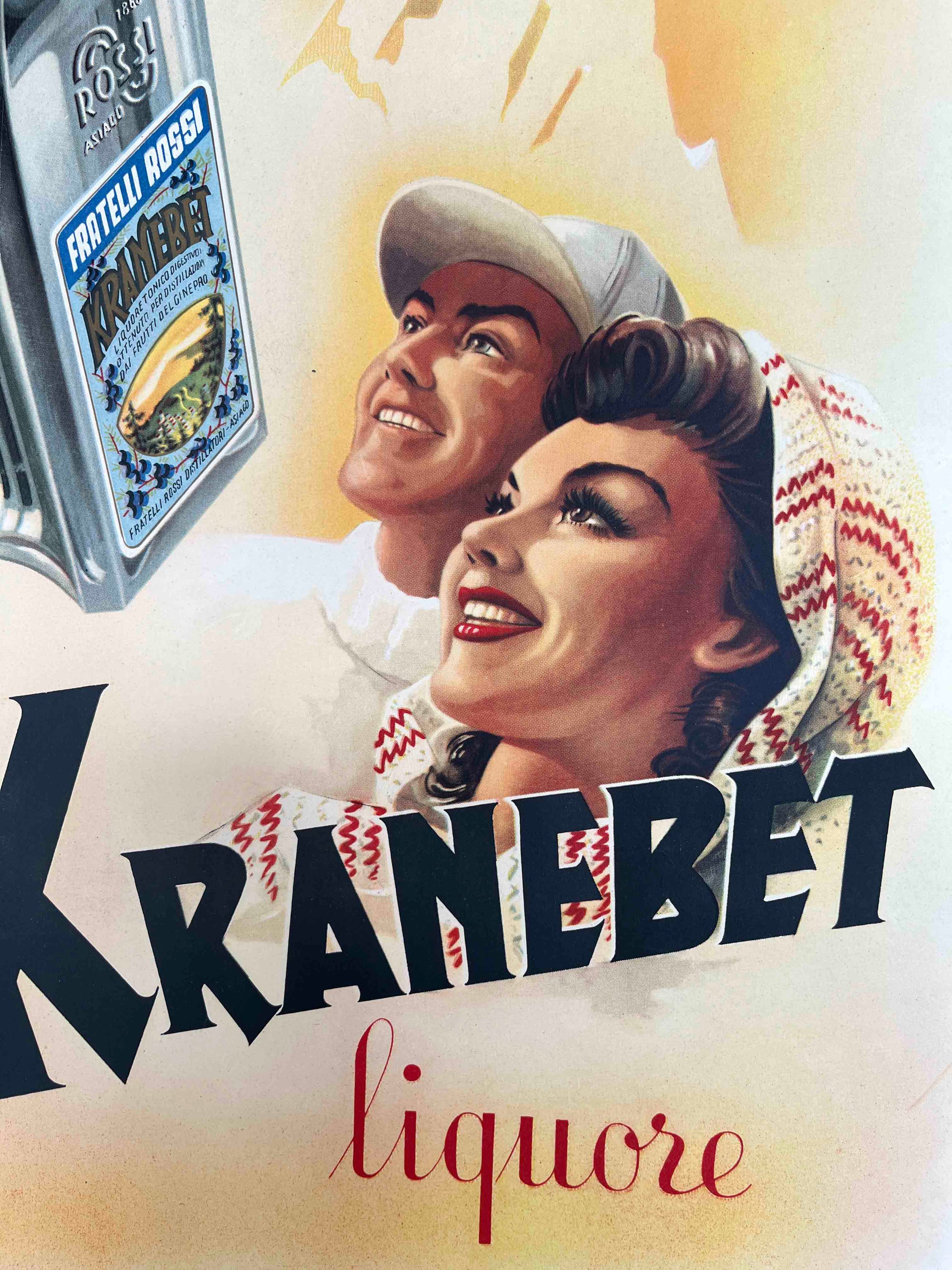 This lively advertising poster promotes Kranebet liqueur, produced by the Italian distillery Fratelli Rossi Distillatori of Asiago, and was printed in 1946, shortly after the end of World War II.