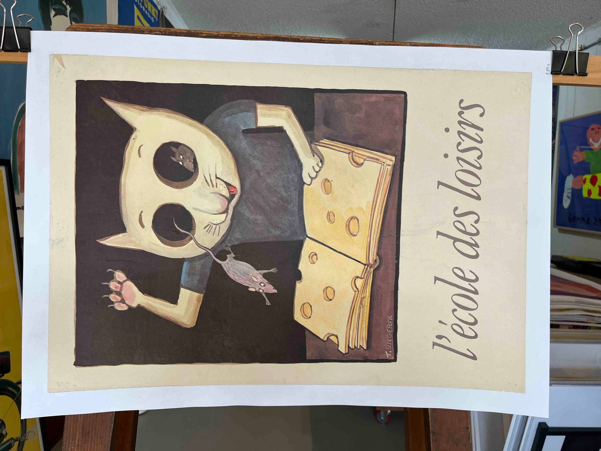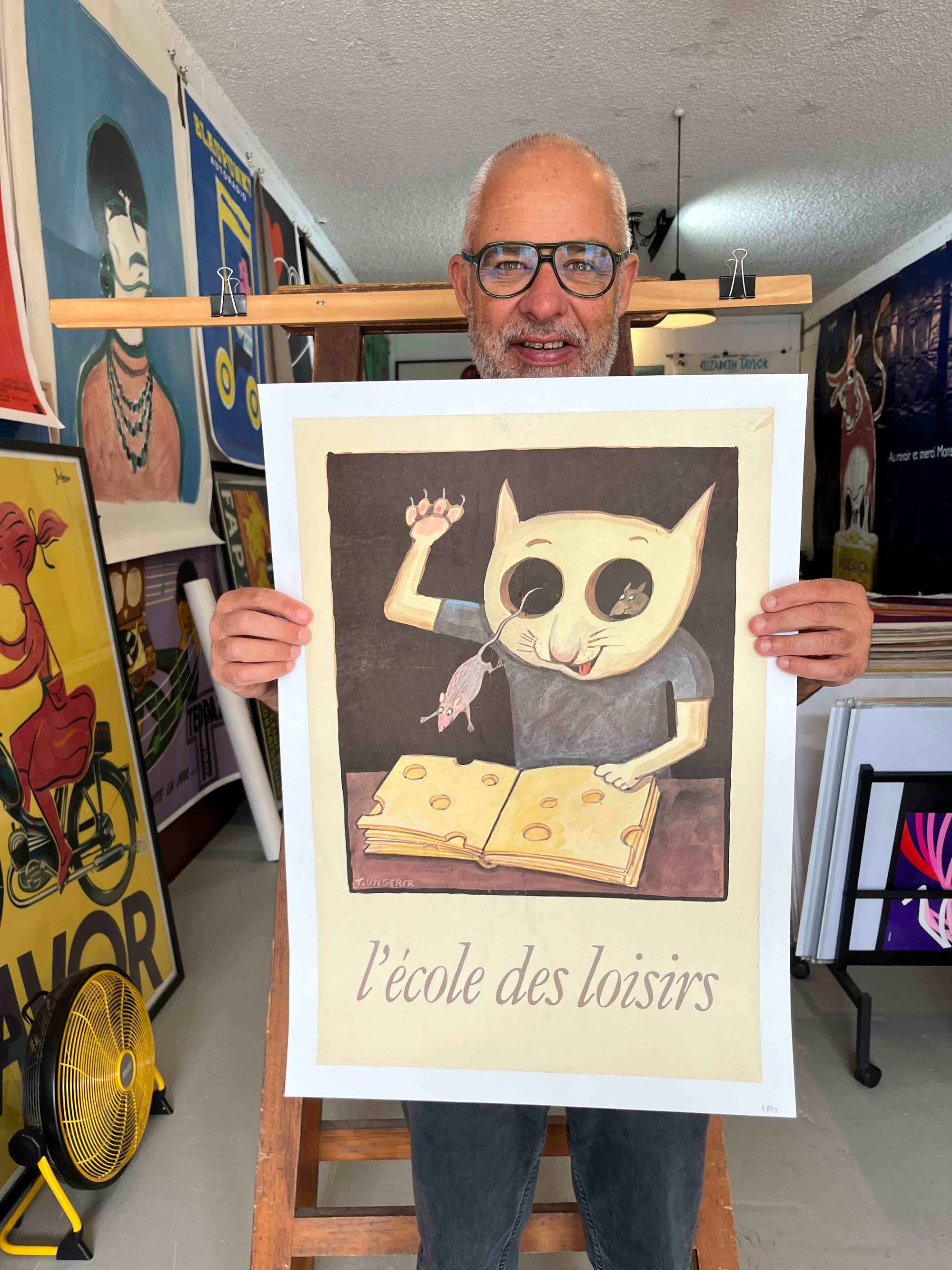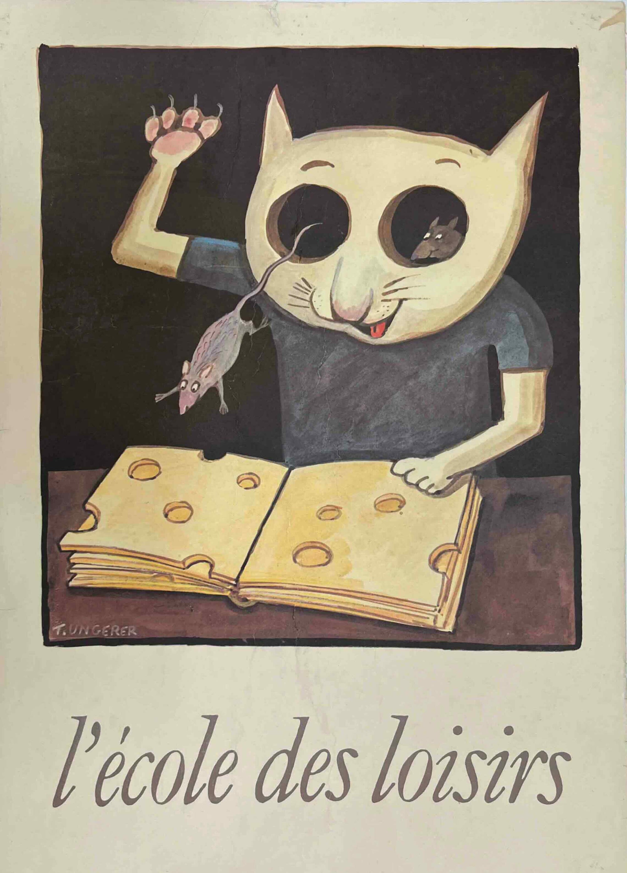 The illustration shows a large-headed cat reading a book made of cheese while holding a mouse, with another mouse peeking from one of its hollow eye sockets. The surreal and humorous scene captures Ungerer’s playful approach to storytelling and his ability to appeal to children while maintaining a clever, slightly subversive tone appreciated by adults as well. Posters like this were produced to promote children’s literature and reading culture in France, often displayed in bookshops, libraries and schools.