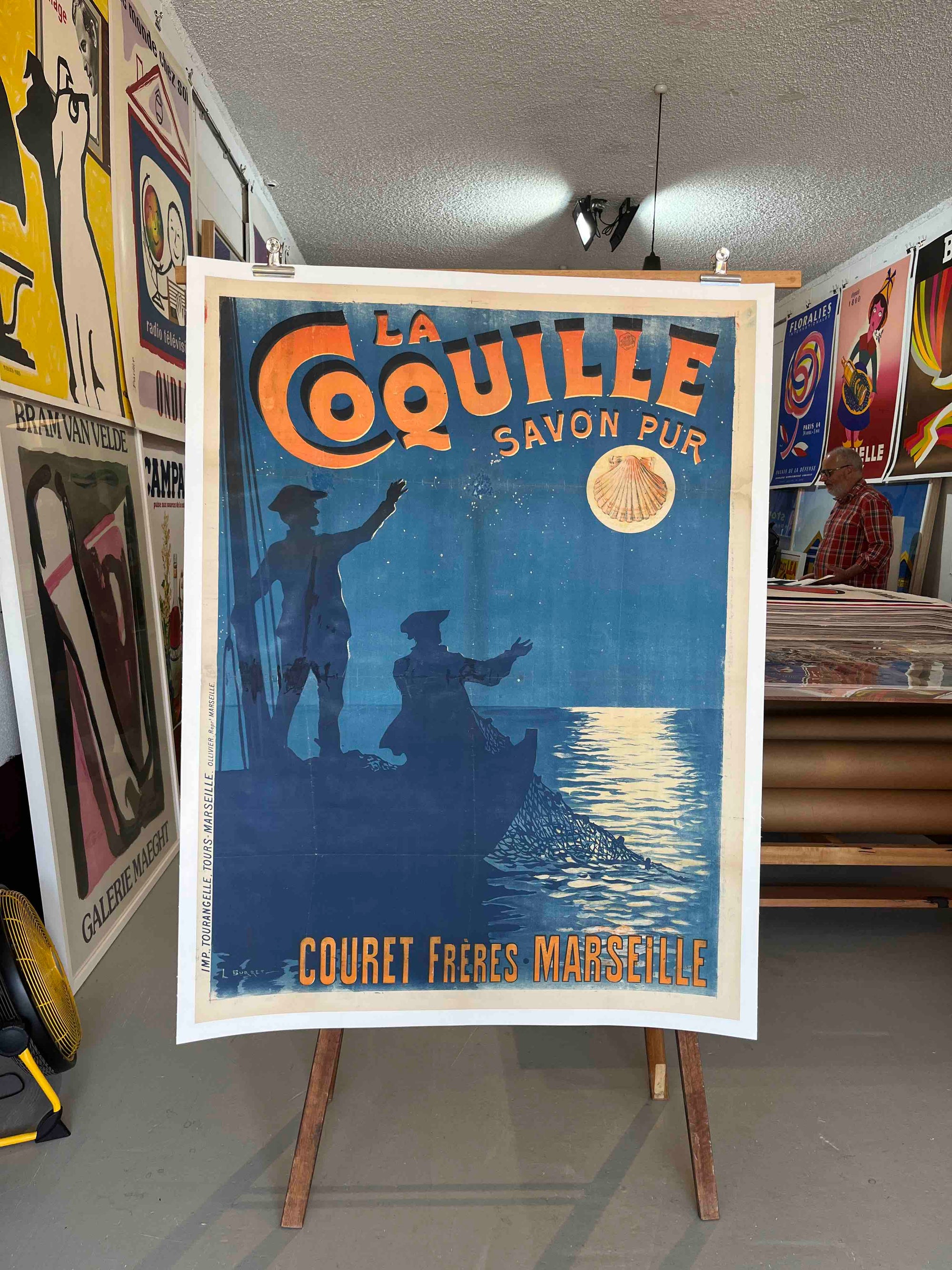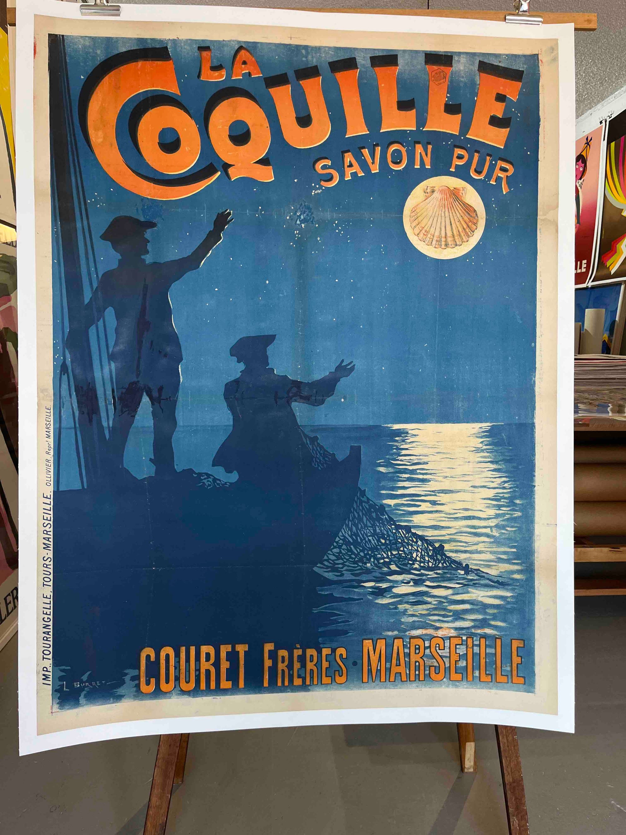 This early 20th century French advertising poster promotes La Coquille – Savon Pur (Pure Soap) by Couret Frères of Marseille. Likely dating to circa 1900-1910, it features silhouetted fishermen working by moonlight, a poetic maritime scene that evokes purity, tradition and the coastal identity of Marseille. With its rich blue palette, shell emblem and bold lettering, the lithograph is a beautifully atmospheric example of classic French commercial design.