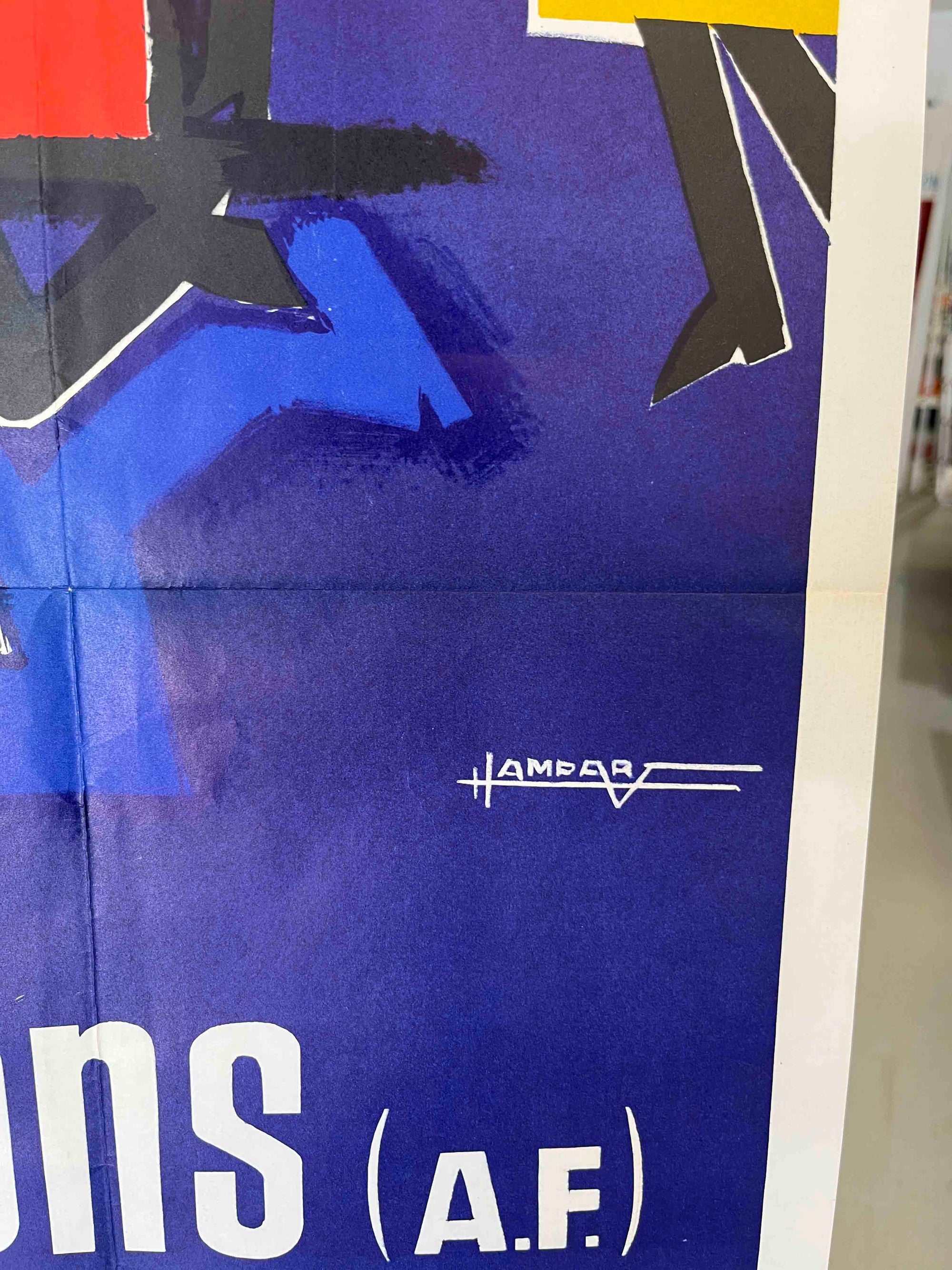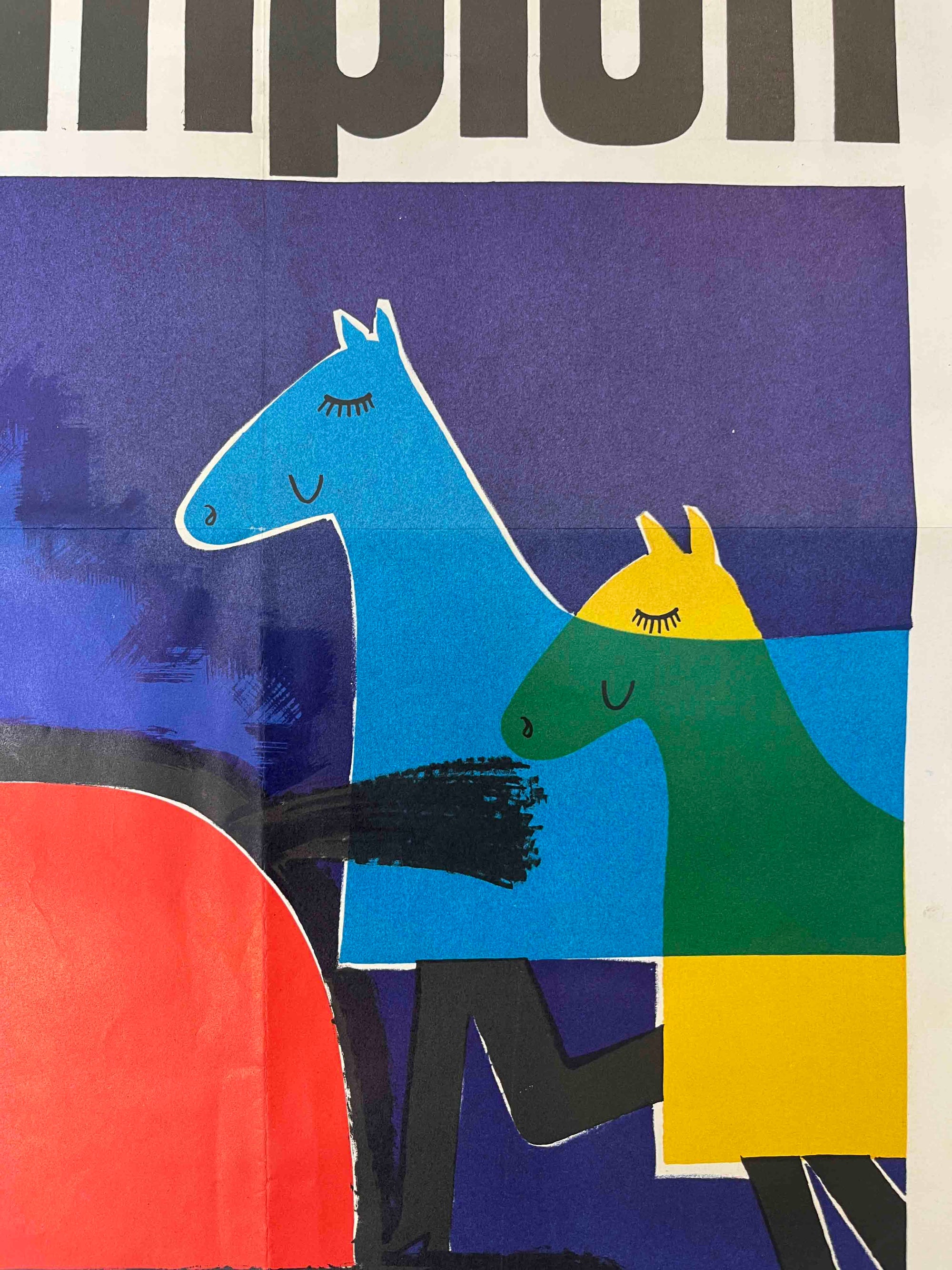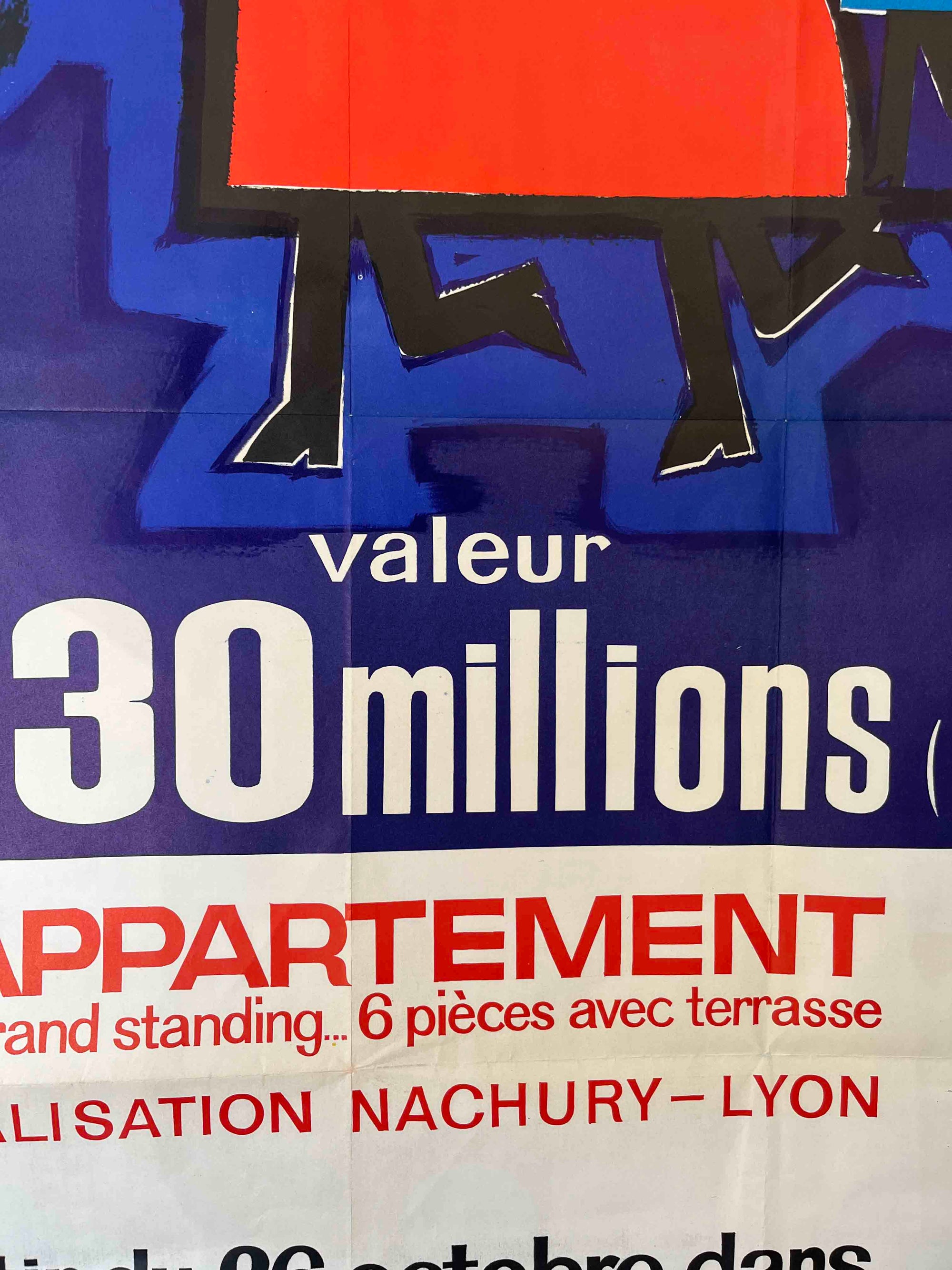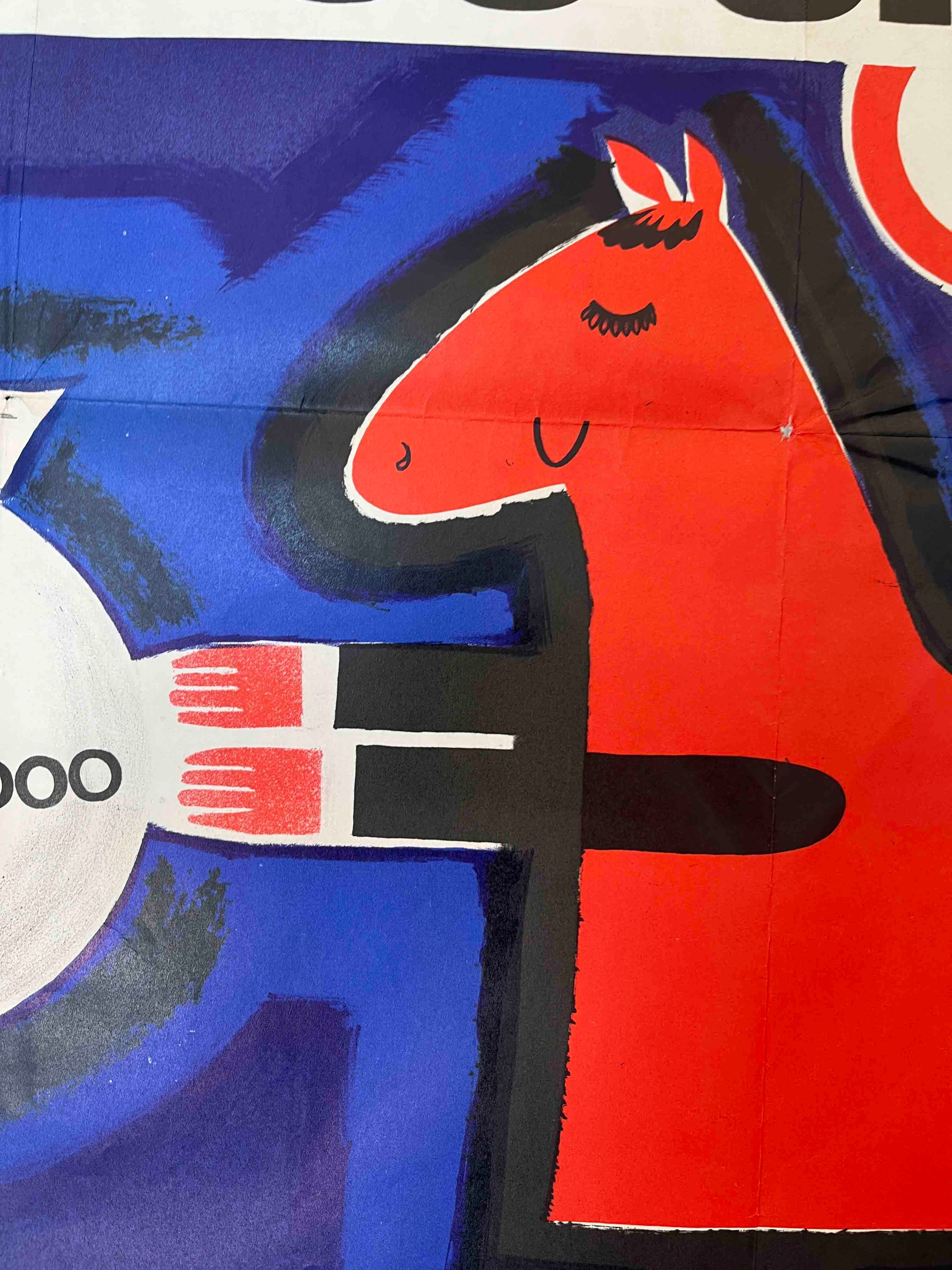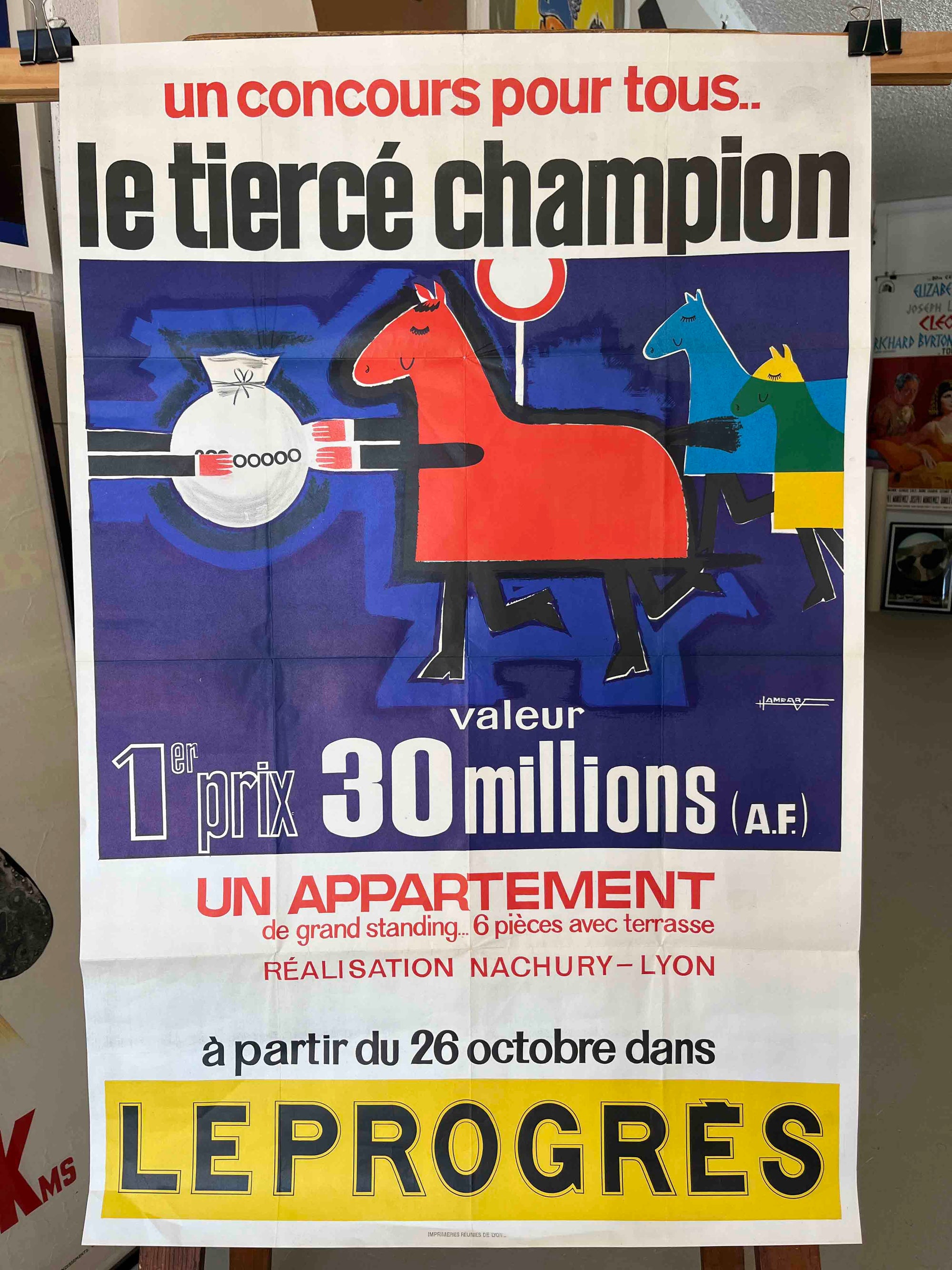 This French advertising poster promotes Le Tiercé Champion, a horse-racing betting competition organised through the Lyon newspaper Le Progrès. Featuring colourful stylised horses pulling a sack of prize money, the illustration reflects the bold graphic style of mid-century French design and is signed by the artist Jean Amédée. Produced in the late 1950s – early 1960s, the poster advertises a competition offering a first prize valued at 30 million anciens francs, awarded in the form of a luxury apartment.