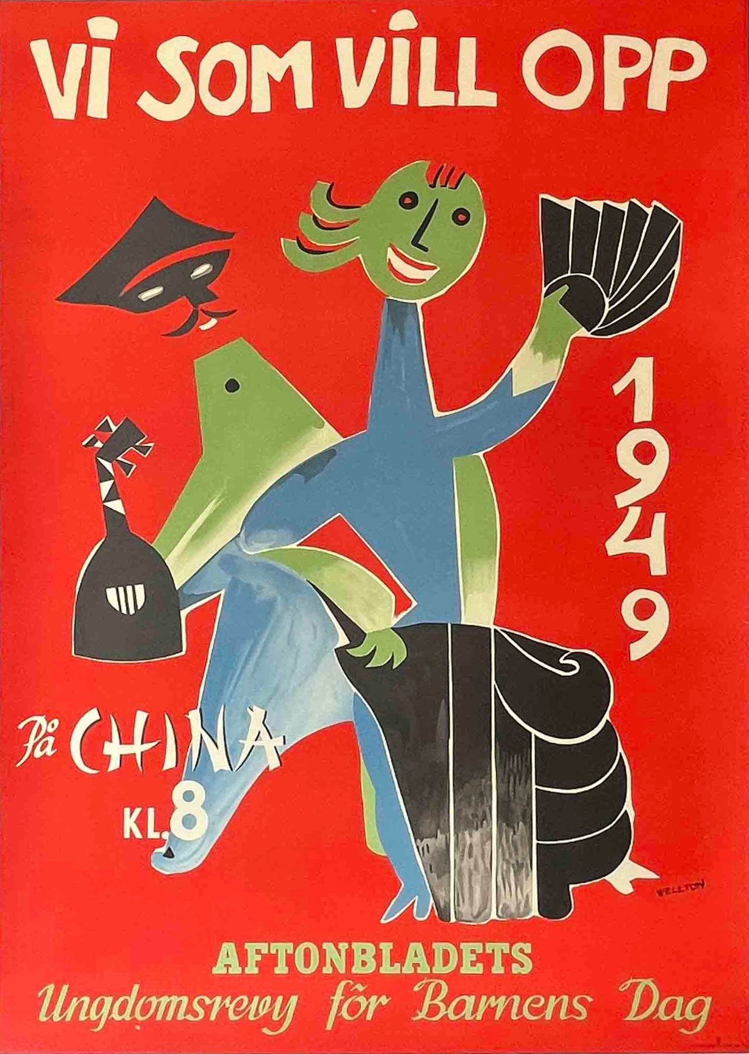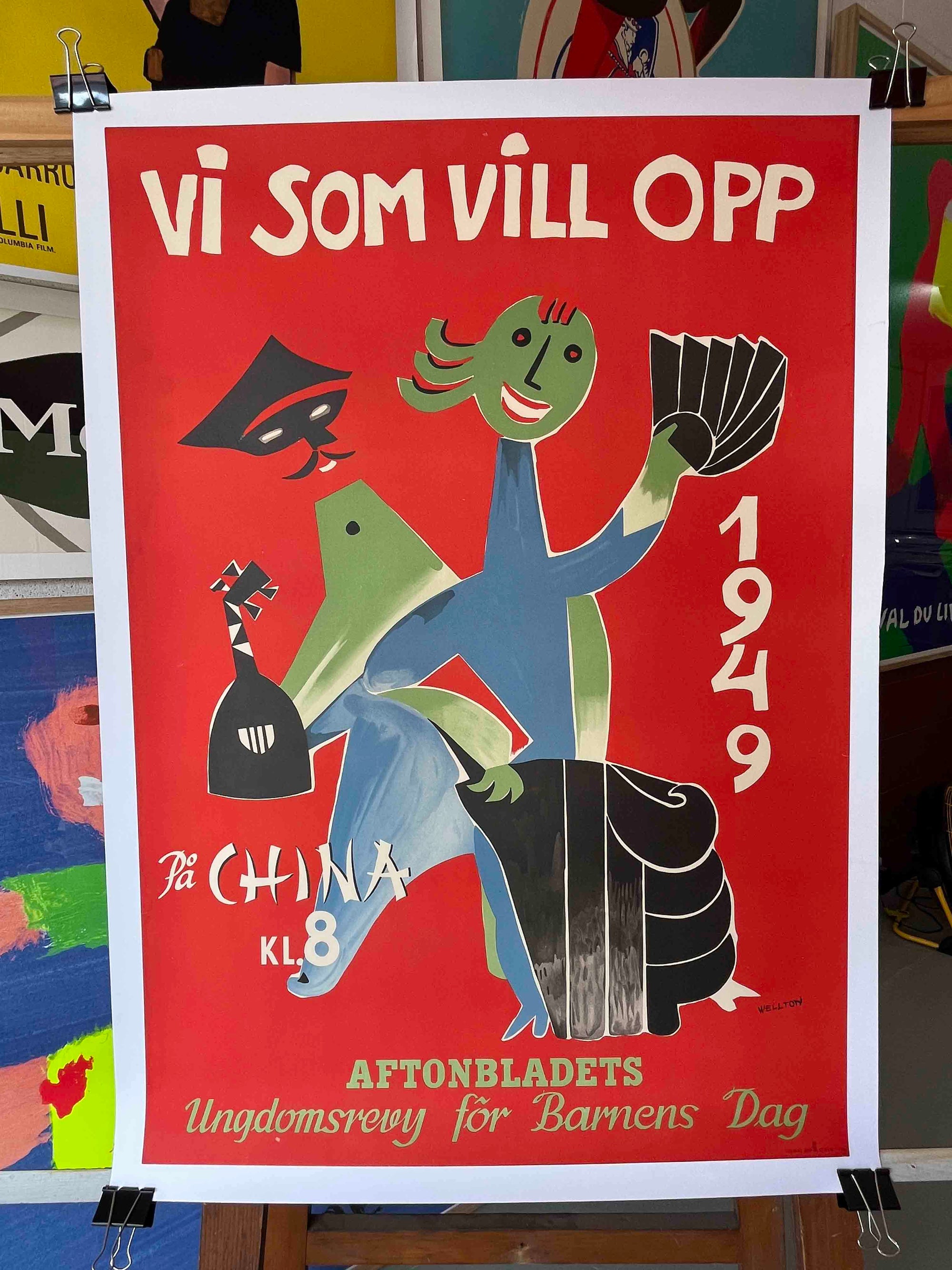 Advertisement for 'Vi som vill opp' (We who want to get up/ahead), an annual youth revue show. The show was a talent competition and entertainment event arranged by the Swedish newspaper Aftonbladet between 1939 and 1952. The specific poster is for the 1949 edition of the show, which was held at the China theatre (China Teatern in Stockholm).