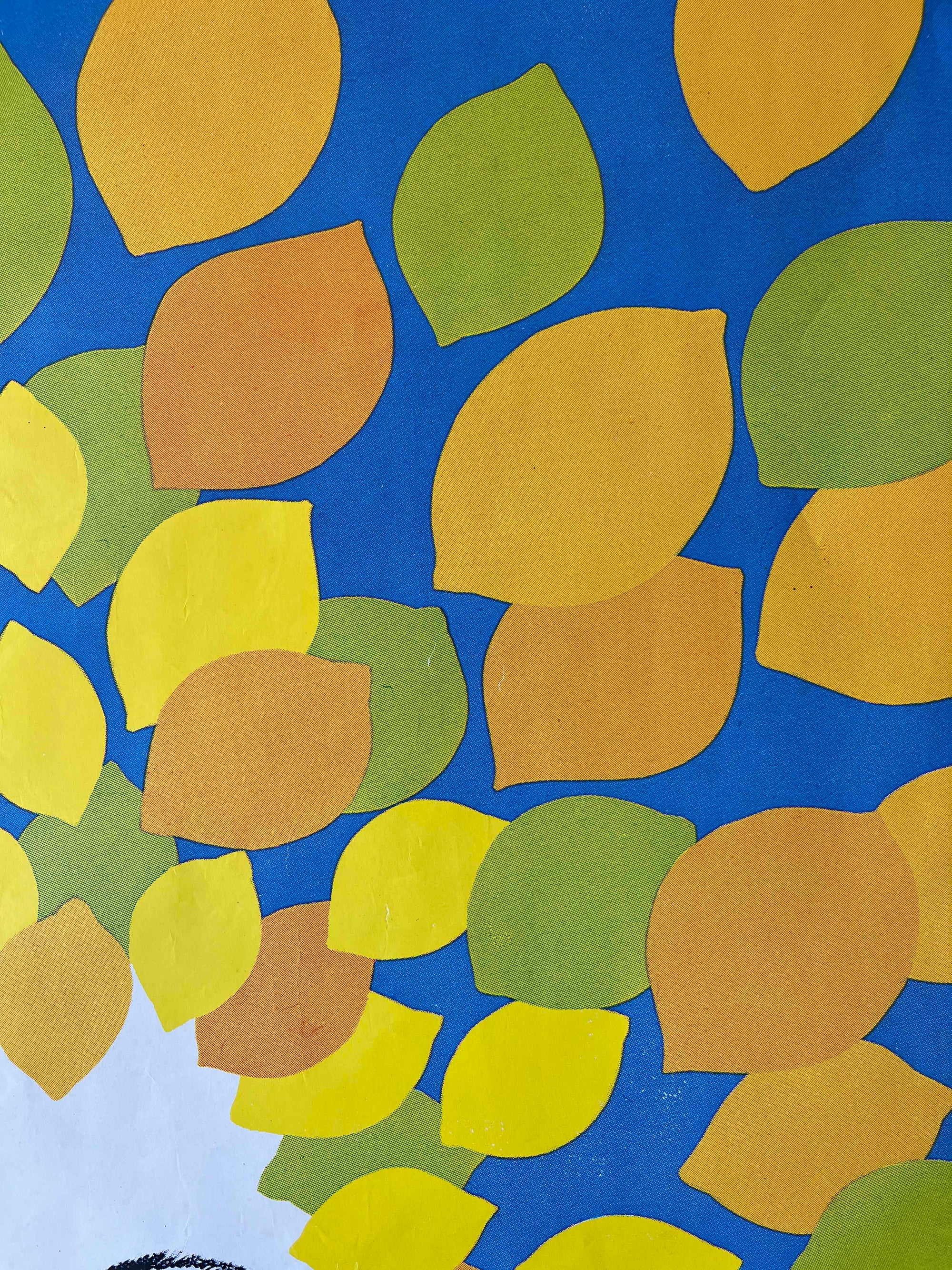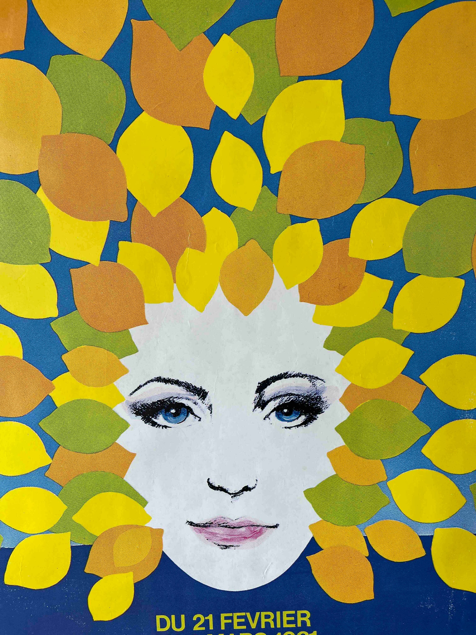 This 1981 'Fête Internationale du Citron – Menton' poster by Italo Bazzoli captures the joyful essence of the French Riviera’s annual Lemon Festival. A woman’s serene face is framed by a burst of yellow, orange, and green lemon shapes against a deep blue sky, symbolising the region’s sunshine and vitality.
