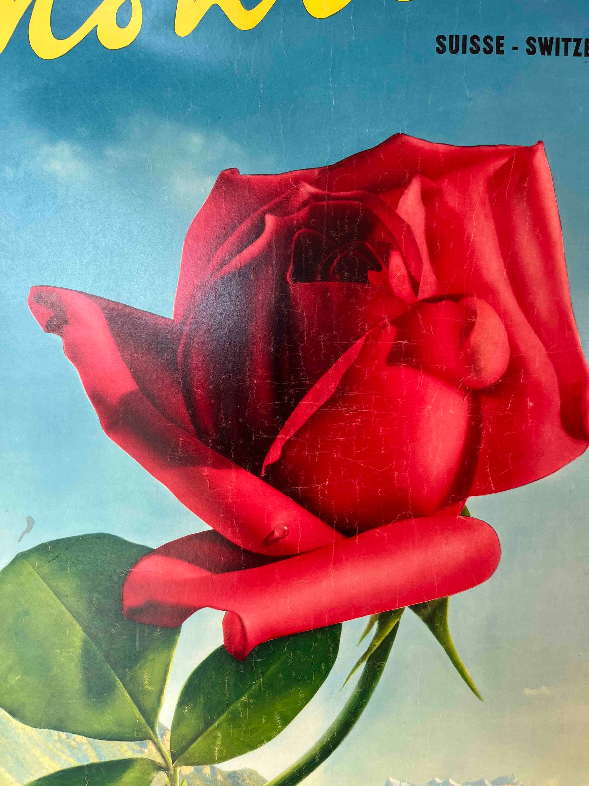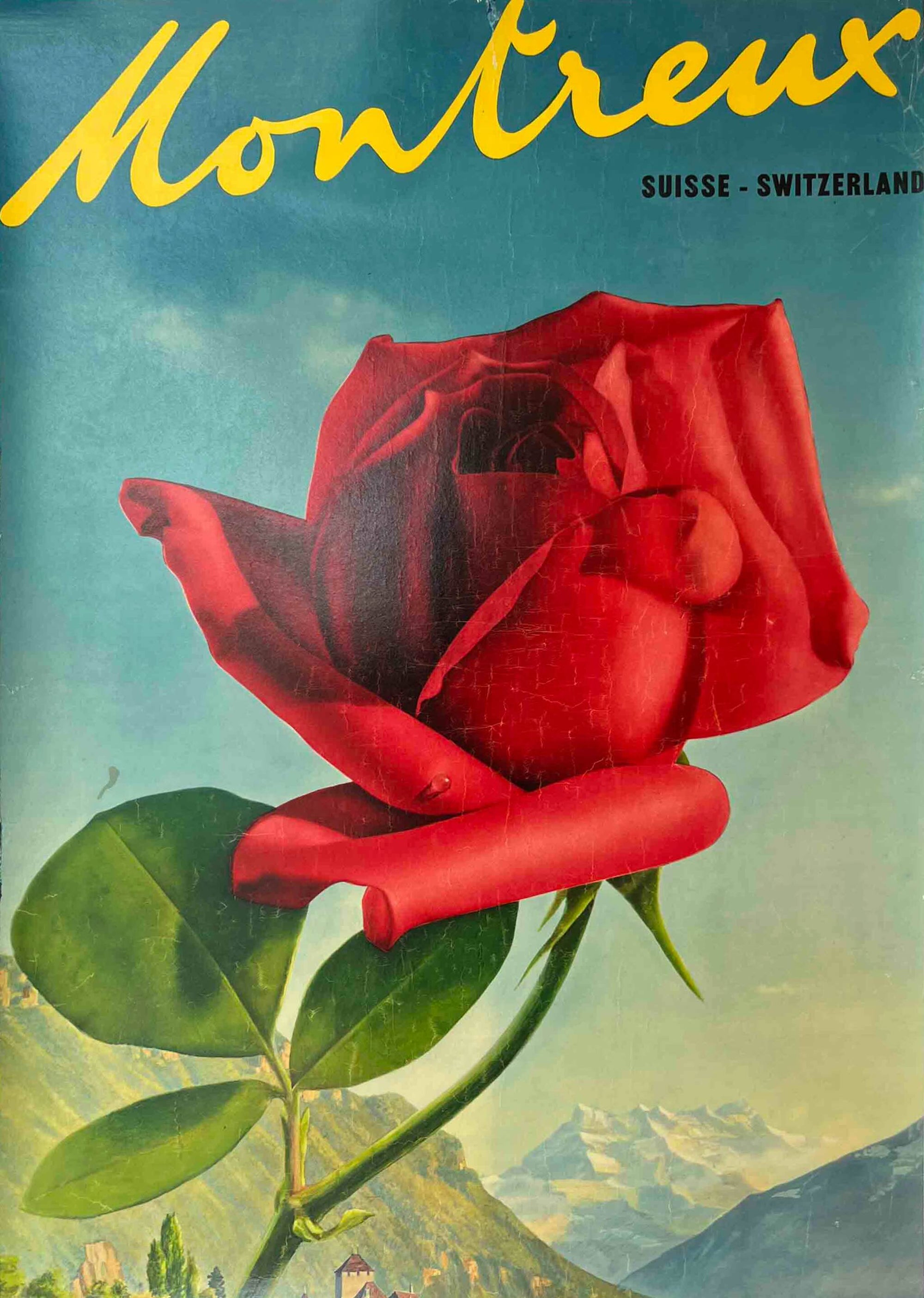 A vintage travel poster for Montreux, Switzerland, featuring a prominent red rose against the backdrop of Lake Geneva and the Alps. Designed by artist Walter Herdeg in 1941 anda well-known example of Swiss graphic design.