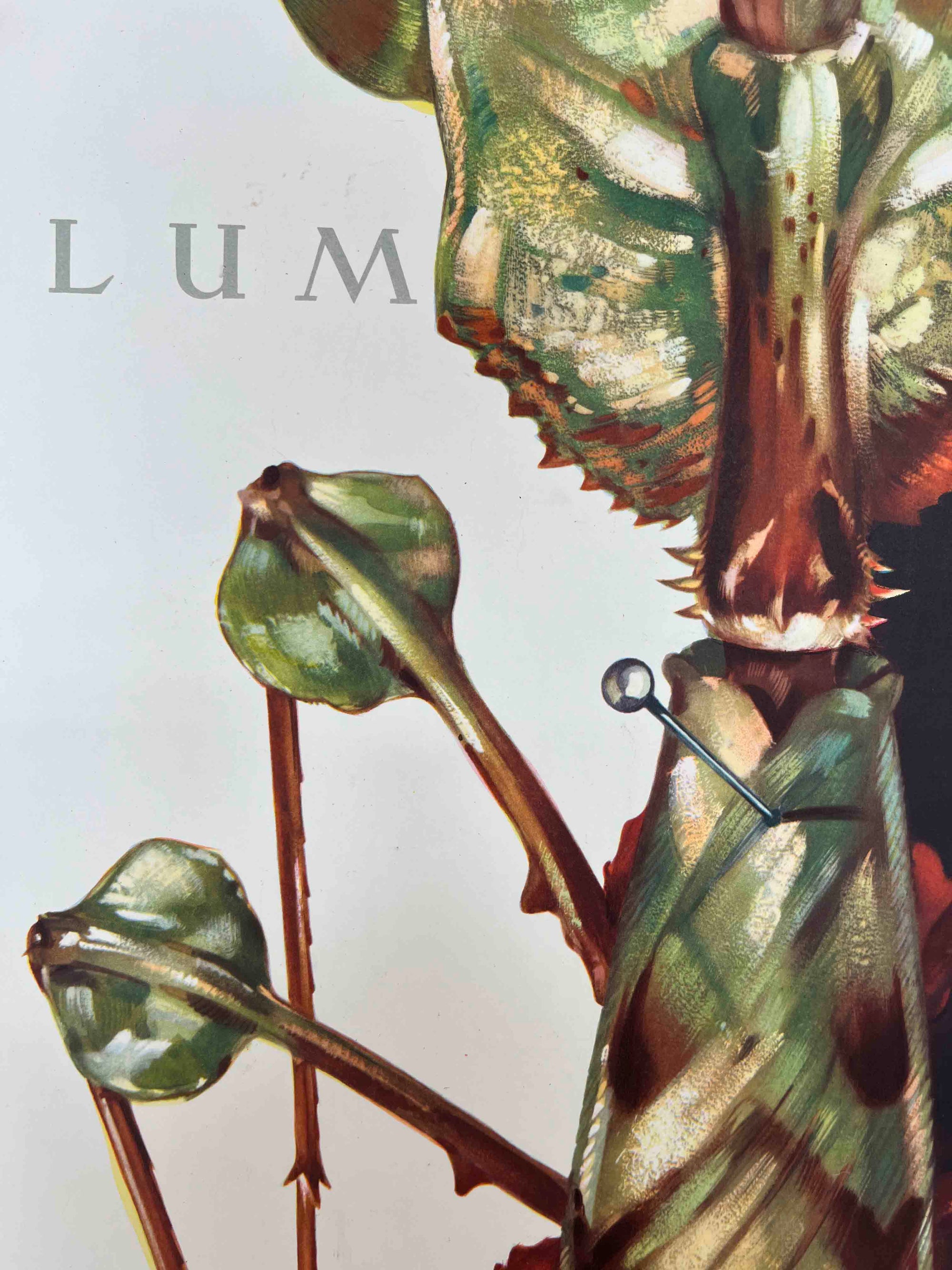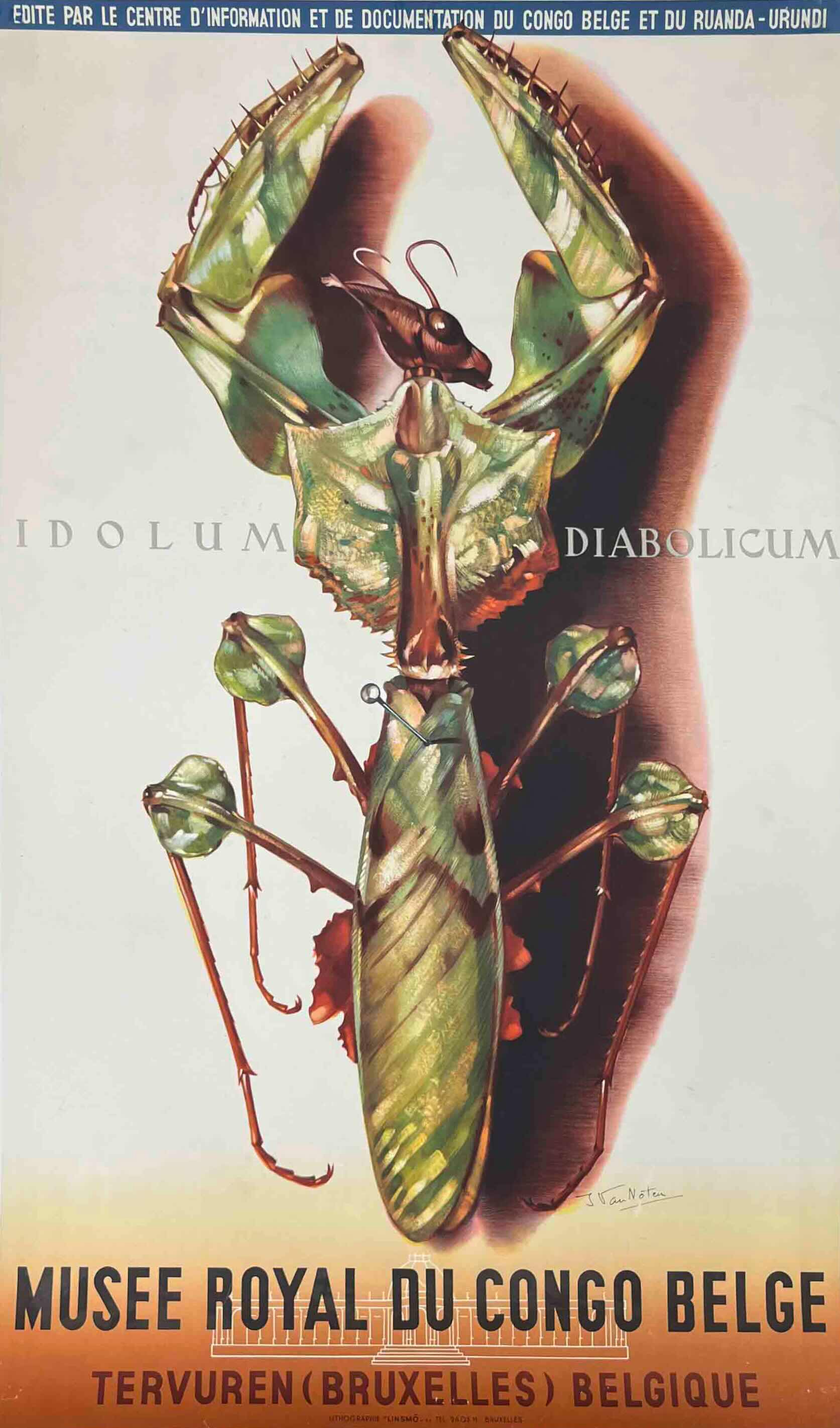 The artwork depicts the dramatic praying mantis Idolomantis diabolica, labelled 'Idolum Diabolicum,' a spectacular species native to Central and East Africa known for its elaborate leaf-like camouflage and flared forelegs. The poster was part of a series created to promote the museum’s collections and to publicise the biodiversity of the then Belgian Congo and Ruanda-Urundi territories. The illustration is by the Belgian naturalist-artist Jacques Van Noten, whose highly detailed scientific style blends accurate entomological study with the dramatic scale typical of mid-century museum posters.