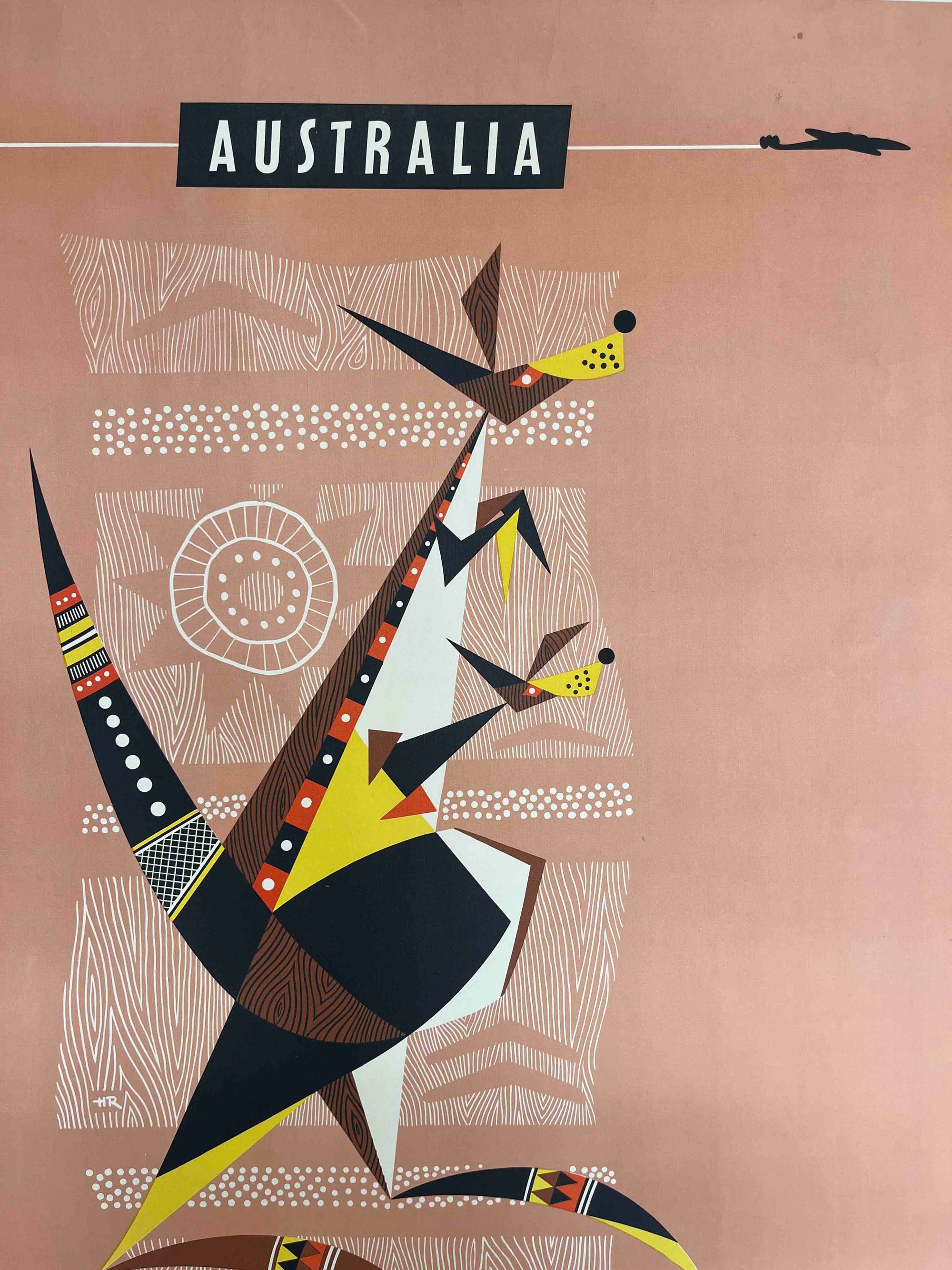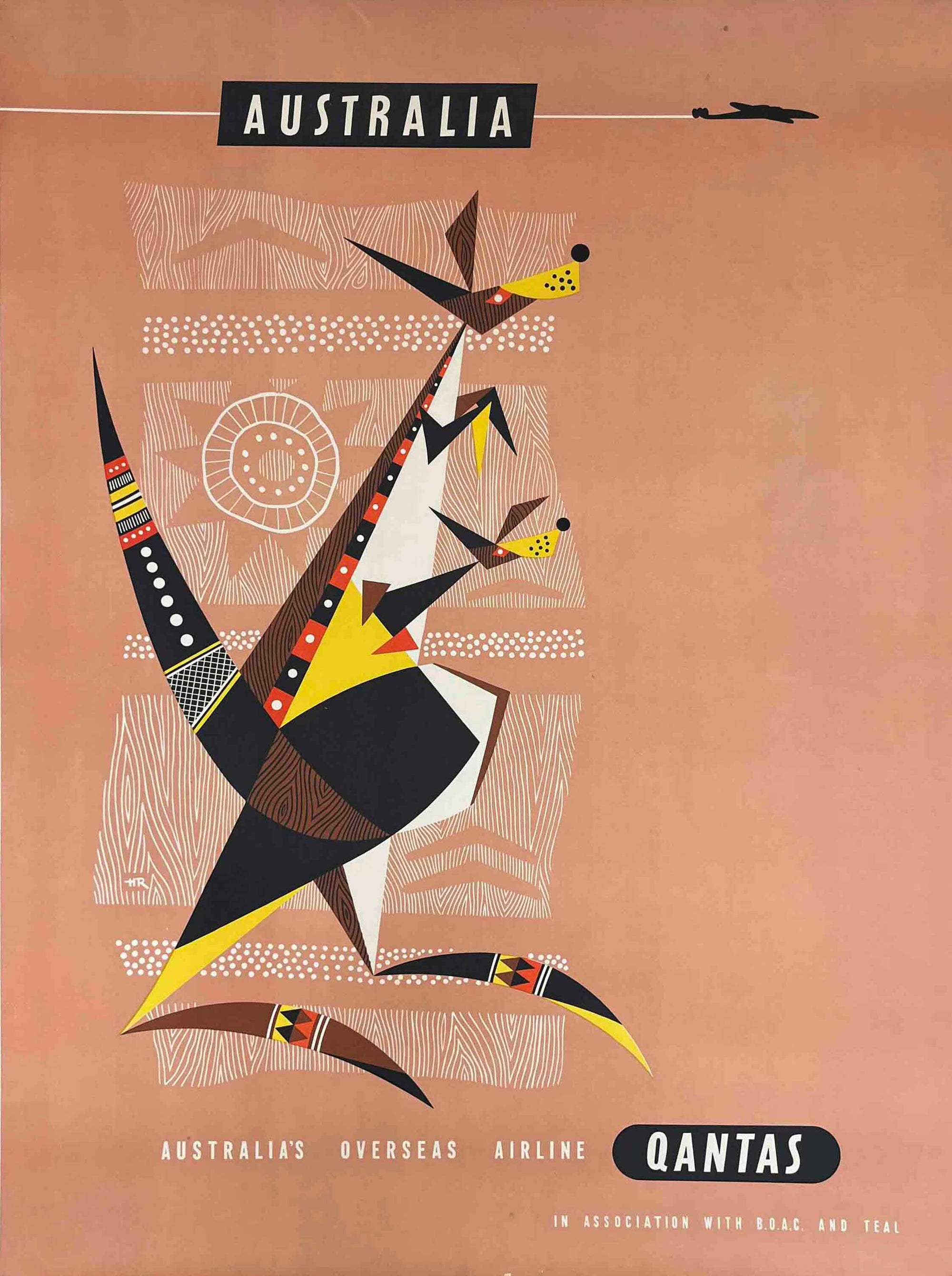 This bold 1950s travel poster for Qantas, designed by Australian commercial artist Harry Rogers, promotes Australia as a distinctive long-haul destination during the era when the airline operated in association with BOAC and TEAL. Featuring a highly stylised kangaroo and joey rendered in sharp, geometric forms, the design blends mid-century modernism with Indigenous-inspired patterning and an earthy Australian palette. Clean typography and strong graphic simplicity give it impact and confidence – a striking example of how Qantas positioned Australia to the world in the golden age of international air travel.