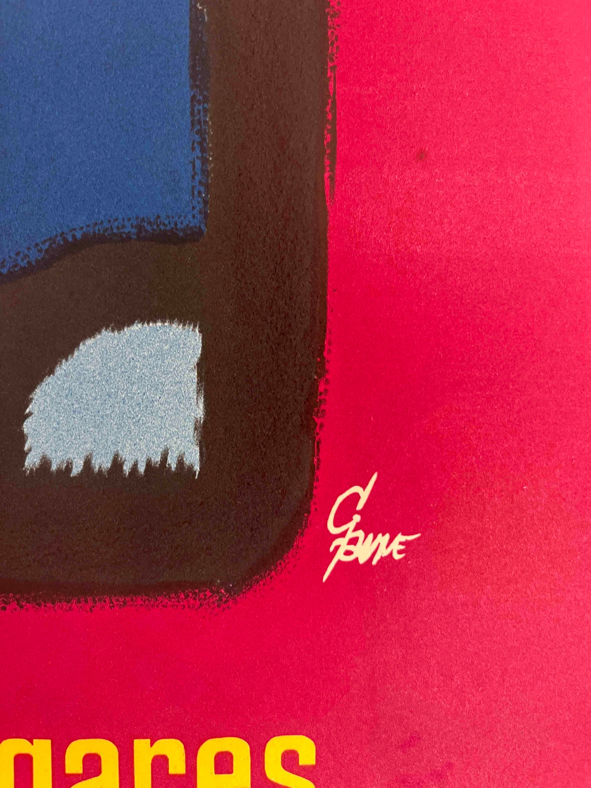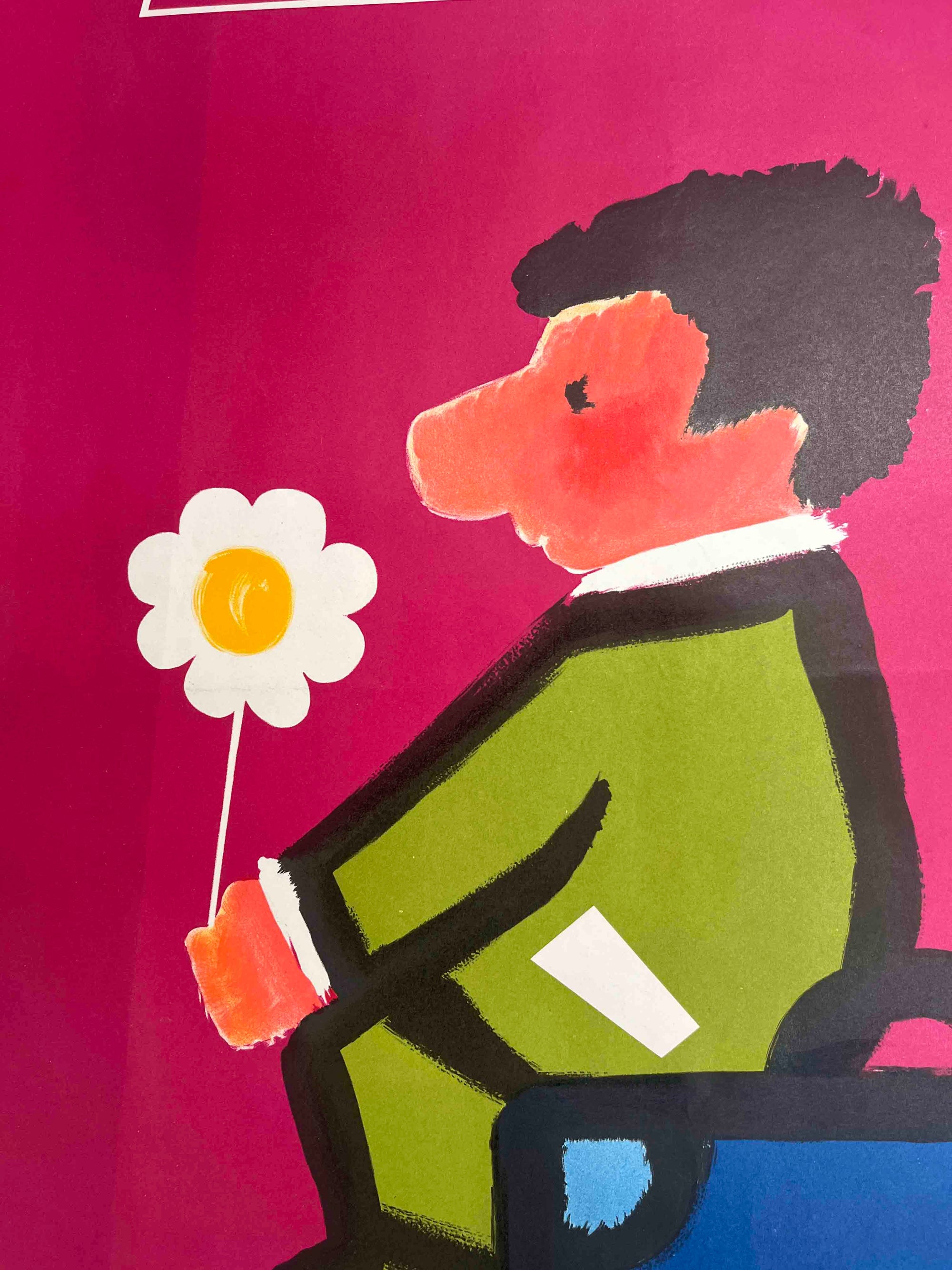 A cheerful mid-century French advertising poster for Société Nationale des Chemins de fer Français (SNCF), promoting its 'lots kilomètres' loyalty scheme – an early rewards program allowing passengers to accumulate kilometres and travel for free. The bold pink background and naïve, graphic illustration of a traveller with oversized suitcase and daisy capture the optimistic, democratic spirit of post-war rail travel in France. Simple, playful and instantly recognisable, it’s a charming example of 1950s-60s French commercial design.
