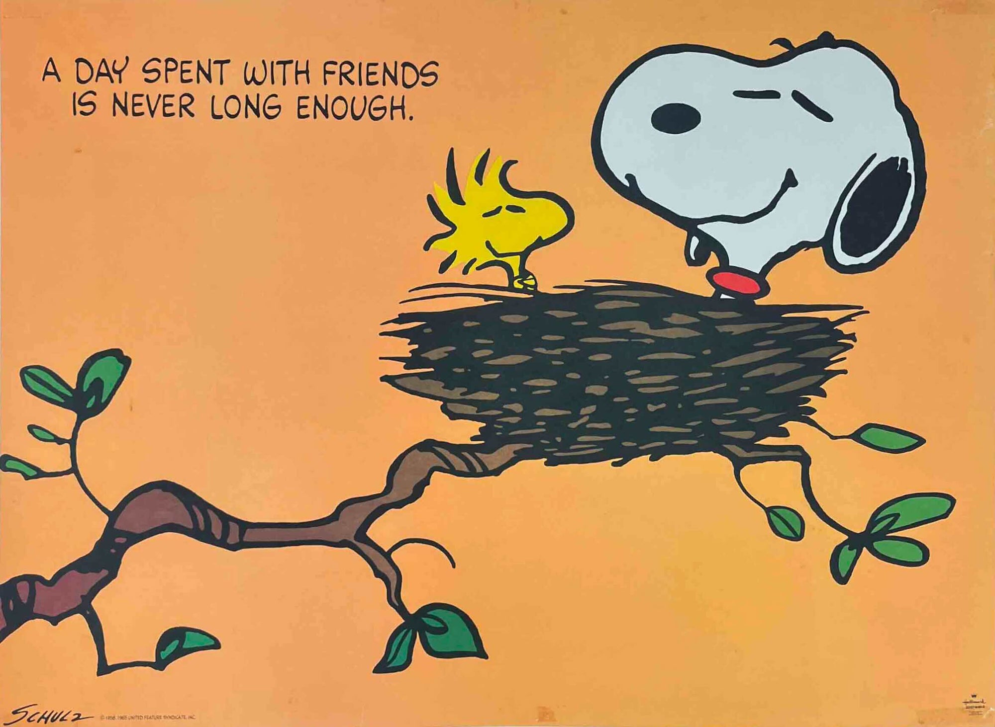 This poster features Snoopy and Woodstock from the beloved comic strip Peanuts, created by American cartoonist Charles M. Schulz. The image shows the two friends sitting together on Snoopy’s nest with the caption 'A day spent with friends is never long enough.' The design reflects Schulz’s simple, expressive drawing style that helped make Peanuts one of the most widely syndicated comic strips in the world.