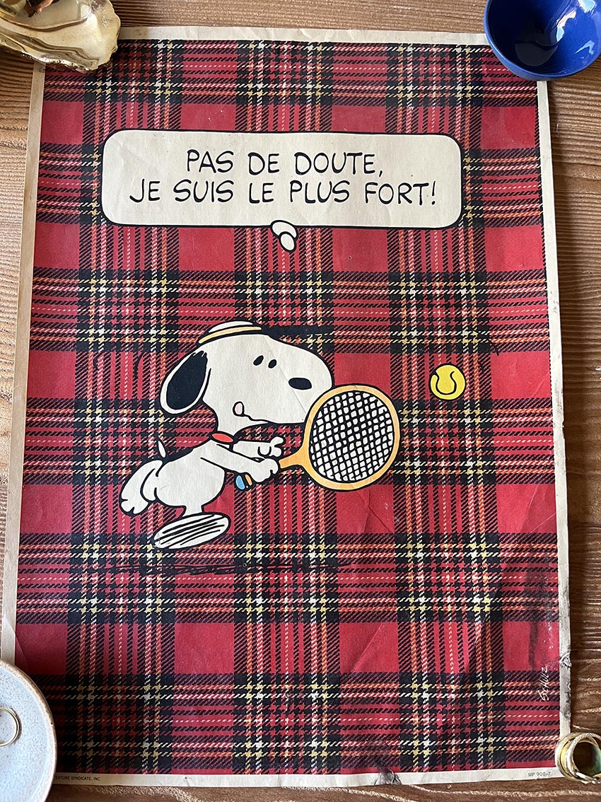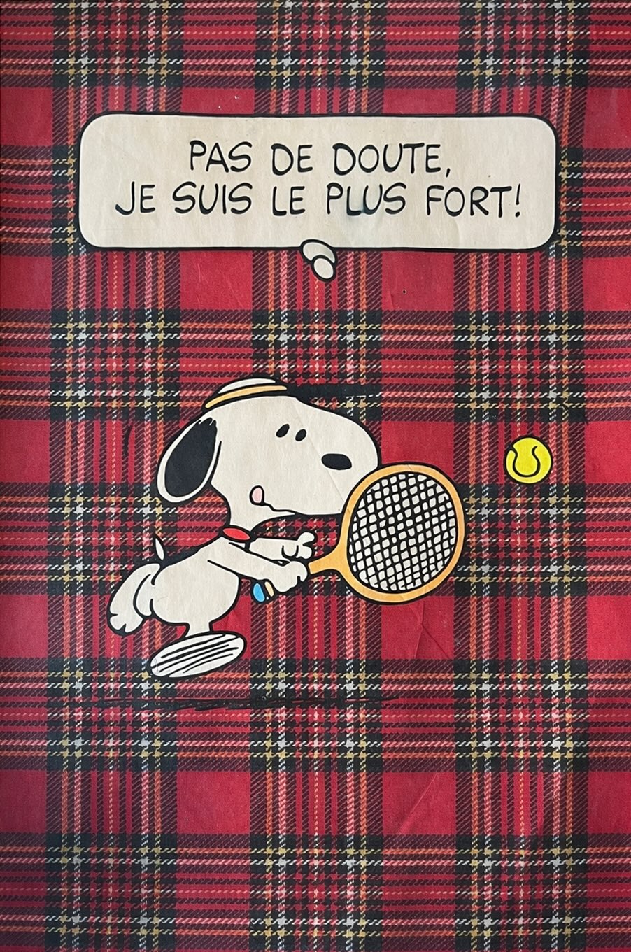 Snoopy tennis poster from the late 1960s–70s, produced during the height of Peanuts’ international popularity. Created from characters by Charles M. Schulz, the design features Snoopy mid-match against a bold tartan backdrop with the French phrase 'Pas de doute, je suis le plus fort!' ('No doubt, I’m the best!').