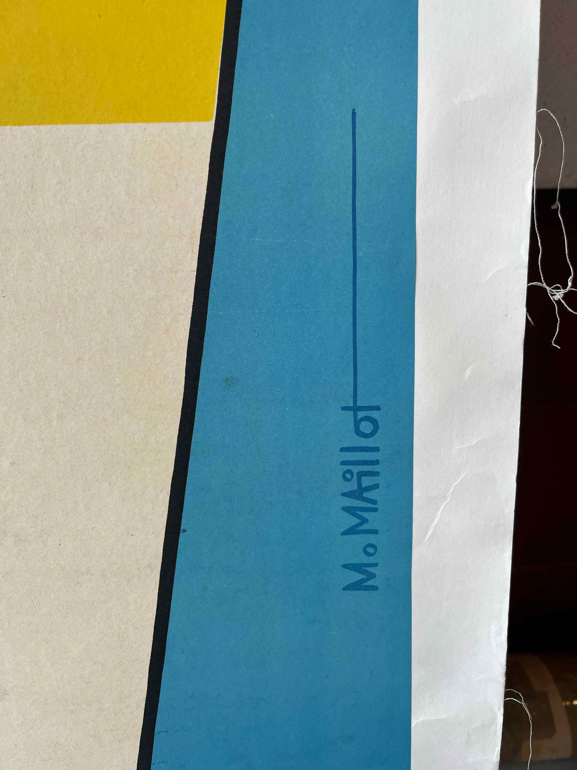 This charming mid-century French poster by M. Maillot was created as an advertising lithograph promoting family ski holidays. Printed by Imprimeries Réunies de Lyon, it depicts a cheerful family set against stylised alpine peaks, rendered in bold primary colours and clean geometric forms typical of 1950s modernism.