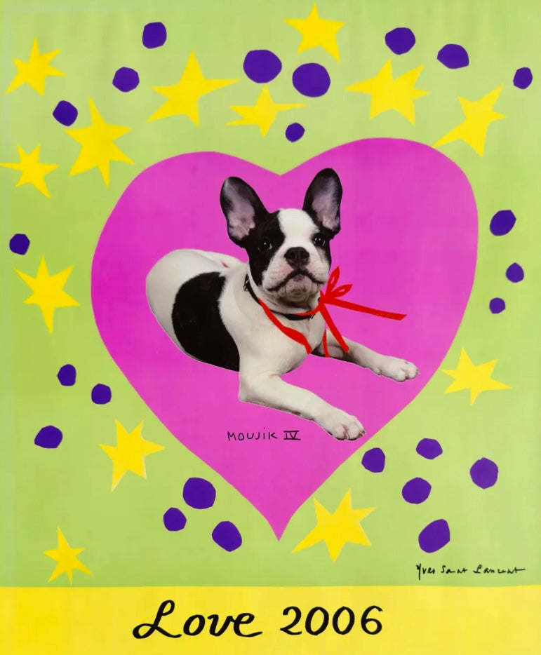 Like several early-2000s designs, it features Moujik – Saint Laurent’s French bulldog – placed at the centre of a bold, graphic composition. Here, the dog sits within a bright pink heart, surrounded by playful stars and dots on a vibrant green background, blending photography with flat, pop-inspired colour and shapes.